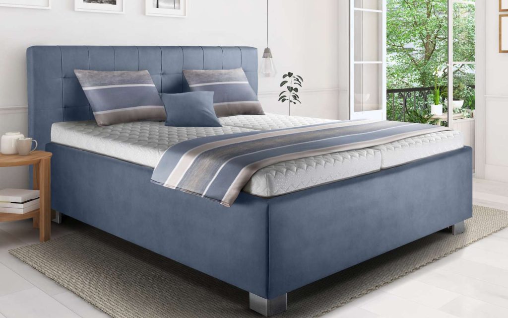 BemerkungPolsterbett in Stoffbezug blau, mit zwei punktelastischen 5-Zonen-Taschenfederkernmatratzen mit guter Stützkraft durch 500 Federn, Höhe ca. 22 cm, 1 x in Härtegrad 2 und 1 x in Härtegrad 3, 2 Lattenrahmen, 28 mehrfach verleimte Federholzleisten in flexiblen Kunststoffkappen gelagert, Kopf- und Fußteil mehrfach verstellbar. Unterbau mit Stoff bezogen, Liegefläche ca. 180 x 200 cm