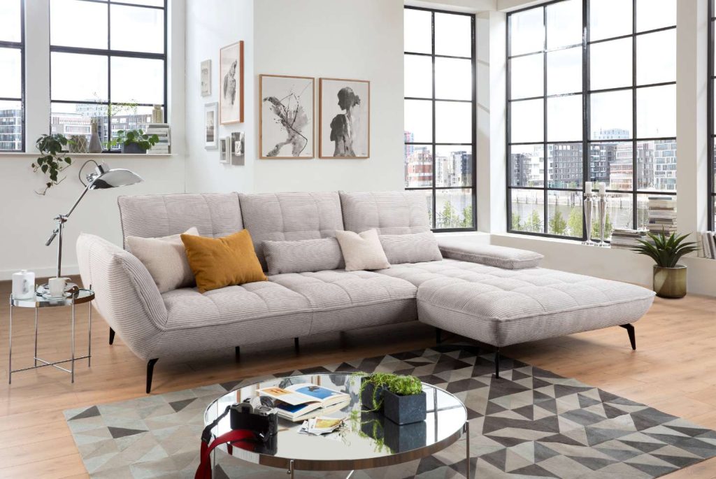 in einer Cord-/Stoff-Kombination in taupe, inkl. Schwenkrücken im 2er-Element und 2 Nierenkissen,