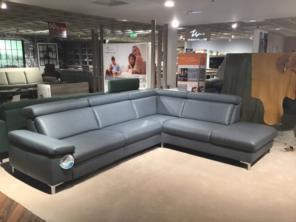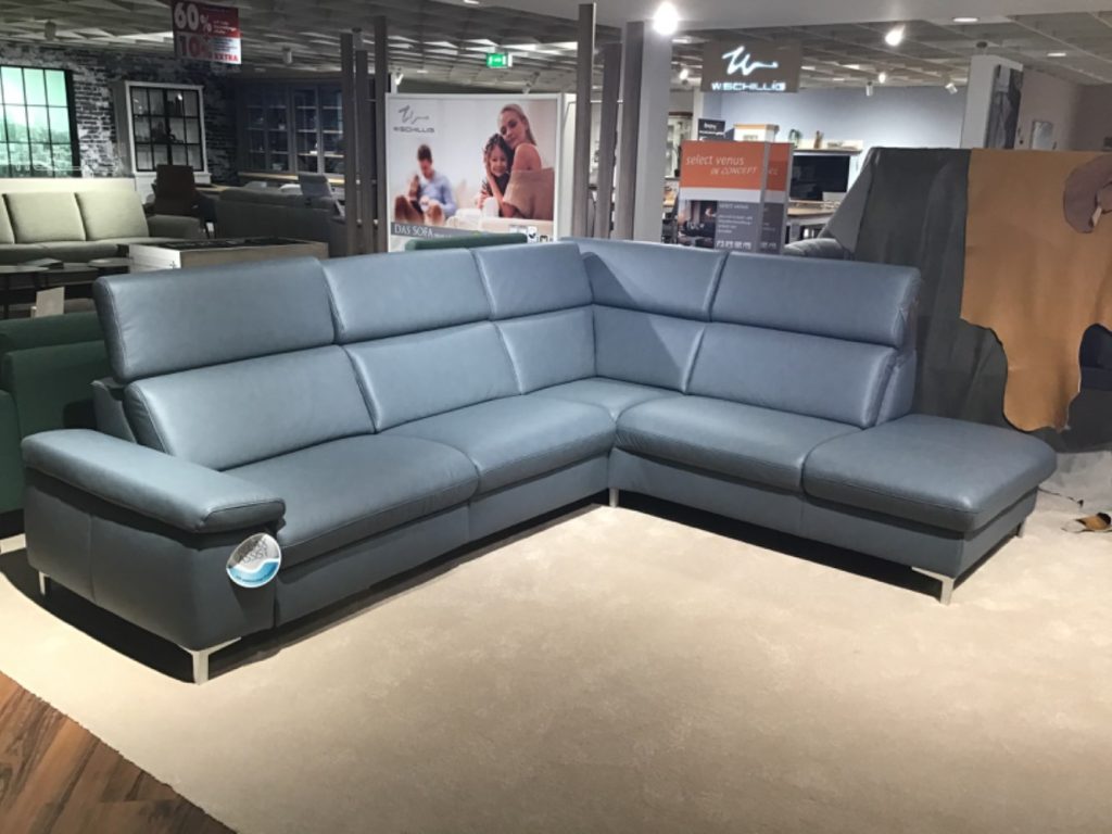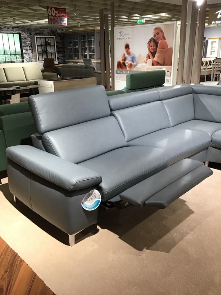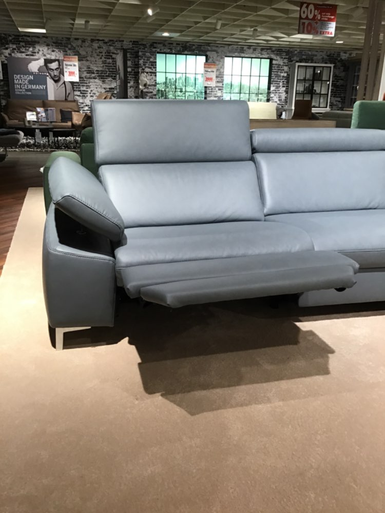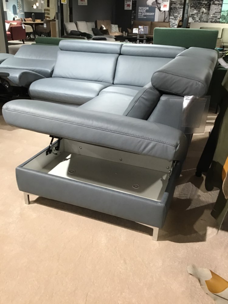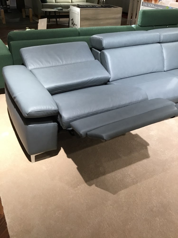 Bemerkung Das Ecksofa Modell MM66952 von POLINOVA vereint modernes Design mit herausragendem Komfort und Funktionalität. In einem eleganten taubenblauen Farbton gehalten, passt dieses Sofa perfekt zu einer Vielzahl von Einrichtungsstilen. Hergestellt aus hochwertigem Echtleder, strahlt es nicht nur Luxus aus, sondern bietet auch eine robuste und langlebige Oberfläche. Die großzügigen Maße von etwa 294x241 cm machen es ideal für geräumige Wohnzimmer und bieten ausreichend Platz zum Entspannen und Genießen. Dank der durchdachten Wall-Away-Herz-Waage-Funktion lässt sich das Sofa bequem positionieren, ohne viel Platz zum Zurückziehen zu benötigen. Die Kopfteilverstellung ermöglicht es, die Sitzposition individuell anzupassen und höchsten Komfort zu garantieren. Ergänzt wird das Design durch einen höhenverstellbaren Armlehnen, die zusätzliche Anpassungsmöglichkeiten bieten. Ein besonderes Highlight ist der Abschlusshocker mit Stauraum, der nicht nur als zusätzliche Sitzgelegenheit dient, sondern auch praktischen Platz für Decken oder andere Gegenstände bietet. Die alufarbenen Metallfüße verleihen dem Sofa einen modernen Touch und sorgen für stabile Standfestigkeit. Als Ausstellungsware bietet dieses Modell die Möglichkeit, hochwertige Möbel zu einem besonders attraktiven Preis zu erwerben.
