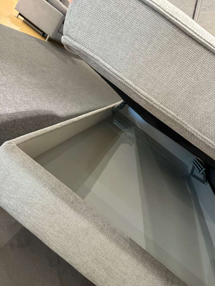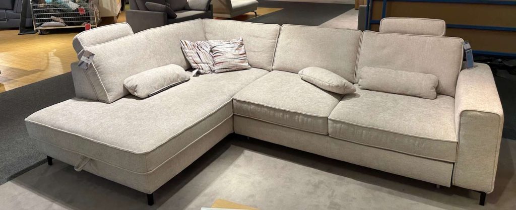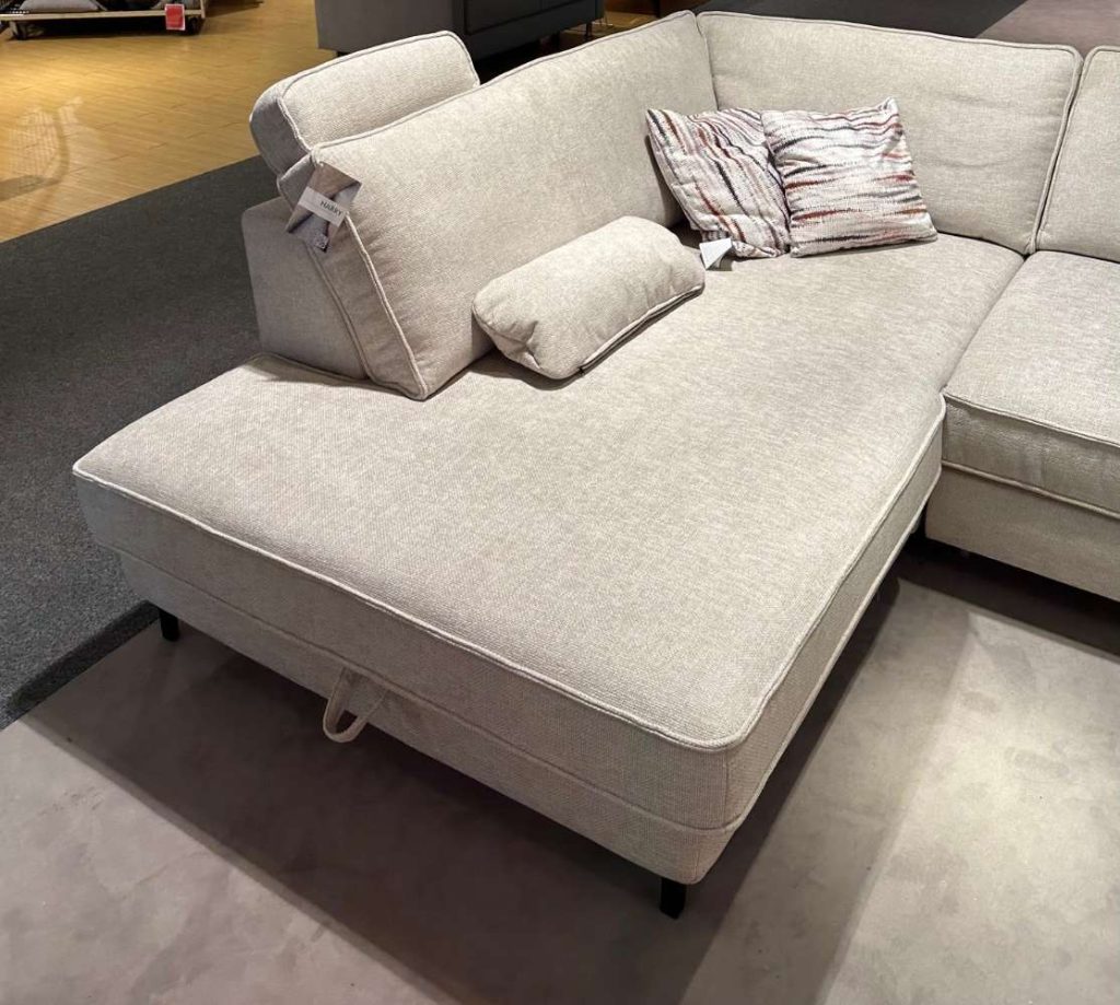 Besonders praktisch ist der integrierte Bettkasten, der zusätzlichen Stauraum bietet und sich leicht aufklappen lässt. Das 1-Sitzer Kombielement mit Anstellhocker und die Kopfstütze auf der linken Seite ergänzen den Sitzkomfort ideal. Die rechte Seite wird durch den 3-Sitzer mit Querschläfer und Armlehne abgerundet, der sich durch seine Wandelbarkeit auszeichnet. Eine Sitztiefenverstellung sorgt zusätzlich dafür, dass Sie die für Sie angenehmste Position finden können. Diese Polstergarnitur verbindet vielseitige Funktionalität mit elegantem Design und wird so zum Herzstück Ihrer Wohnzimmergestaltung.