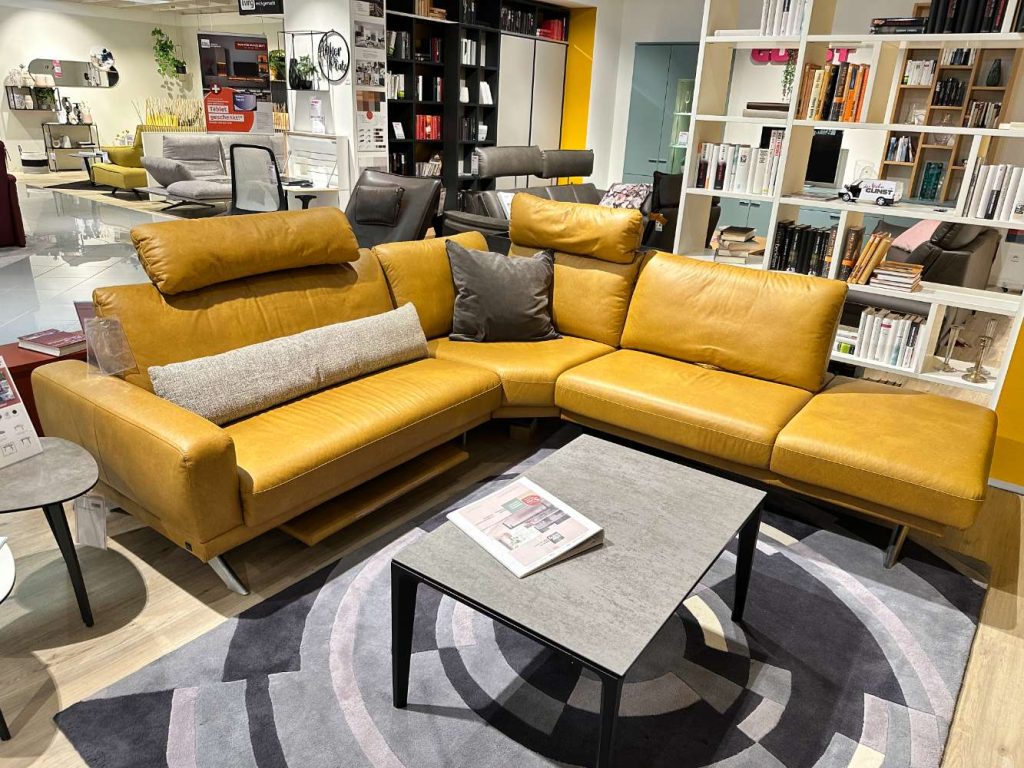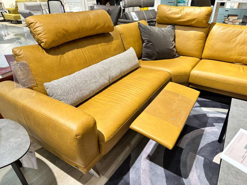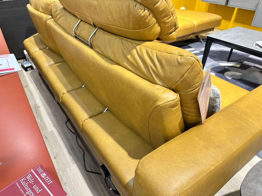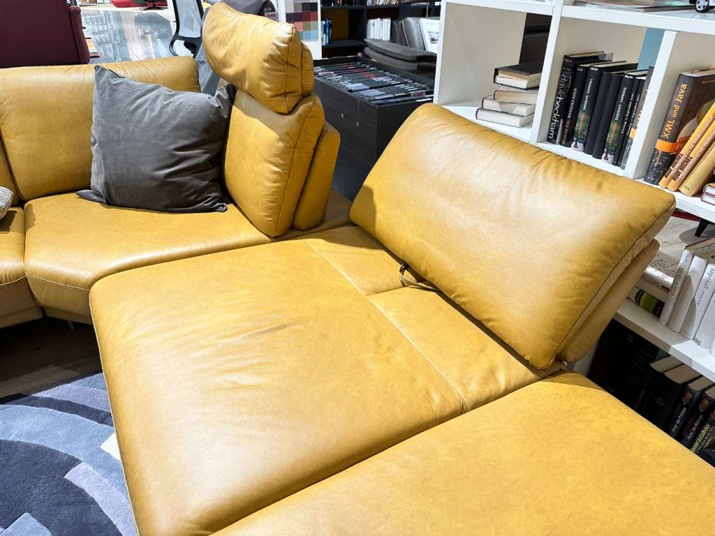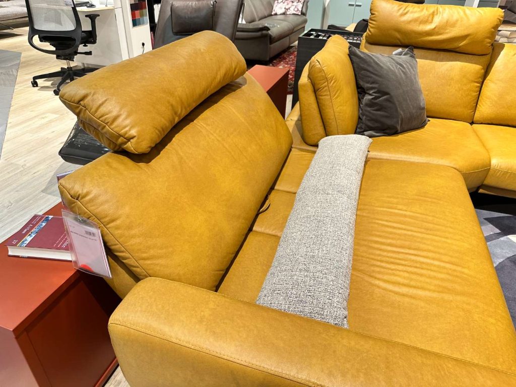 Polstergarnitur Interliving IL4220 – Bezug: Echt Leder longlife, curcuma – 2-sitzer mit elektrischer Fußverstellung – Trapezecke – Kopfstütze 75cm – Kopfstütze 90cm – mit Akku Ladestation