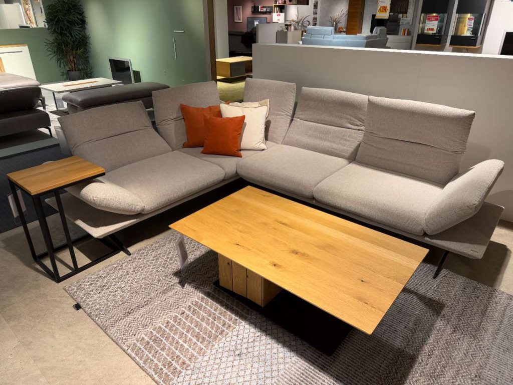 Bemerkung Entdecken Sie die exquisite Polstergarnitur von KOINOR, ein Meisterwerk an Komfort und Design. Diese Ausstellungsware vereint hochwertige Stoffmaterialien mit modernen metallischen Akzenten. Die Polstergarnitur präsentiert sich in großzügigen Maßen von etwa 209x277 cm und strahlt eine einladende Eleganz aus. Die schwarzen Metallkufen verleihen dem Möbelstück ein stilvolles Finish, das sowohl Robustheit als auch zeitgenössische Ästhetik unterstreicht. Besonders hervorzuheben sind die variablen Anpassungsmöglichkeiten: Rücken-, Kopf- und Armteilverstellungen sorgen für höchsten Sitzkomfort und ermöglichen eine Anpassung an individuelle Bedürfnisse und Vorlieben. Ein zusätzlicher Bonus ist das im Preis enthaltene Flatterkissen, das zusätzlichen Komfort bietet und das Gesamtbild harmonisch abrundet. Diese Polstergarnitur von KOINOR ist nicht nur ein Möbelstück, sondern ein Ort der Entspannung und des Stils in jedem Zuhause.
