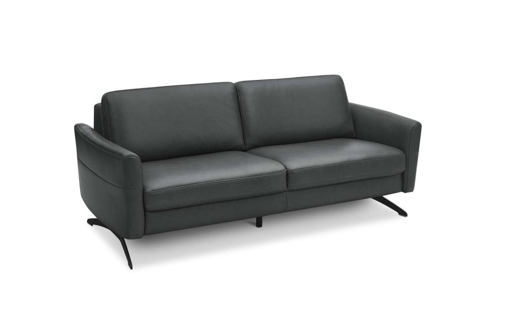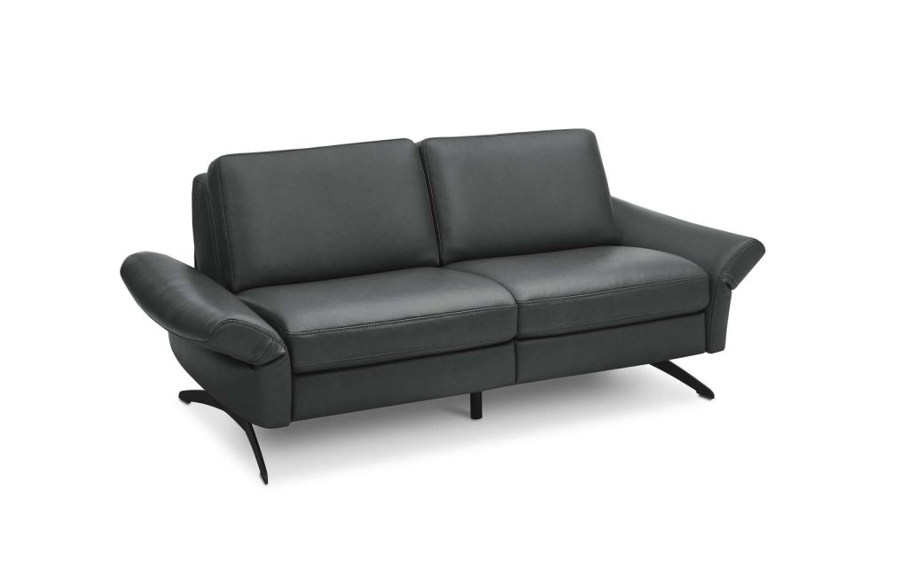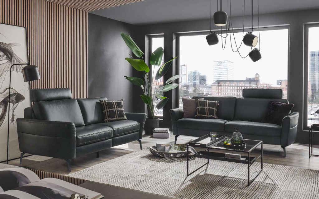 BemerkungZeitlose Garnitur mit echt Lederbezug Rodeo in der Farbe charcoal, Superflex-Form-Kaltschaum in Sitzhärte F2 mittel auf Nosag Stahlwellenfedern, Rücken aus hochwertigem Kaltschaum, unecht bezogen, Metallfüße in Schwarz, bestehend aus 3 Sitzer und 2,5 Sitzer mit Armlehnen, ohne Verstellung, harmoniert mit allen modernen Einrichtungsstilen, Sitzhöhe ca. 48 cm, Maße 3 Sitzer, B/H/T ca. 218 x 87 x 99 cm, 2,5-Sitzer, B/H/T ca.188 x 87 x 99 cm.
