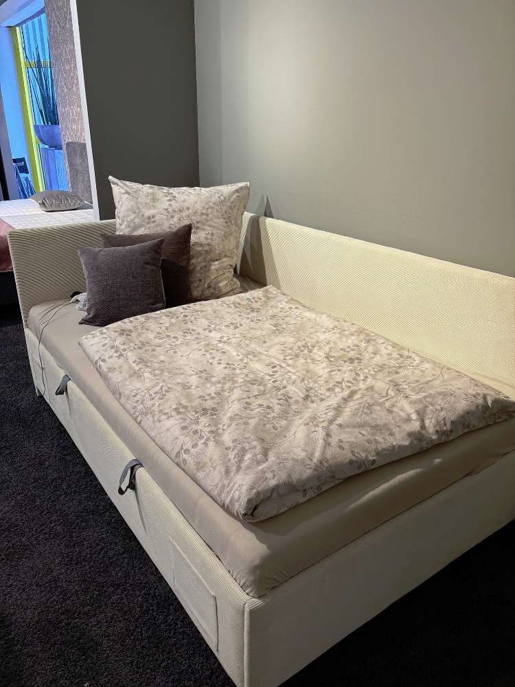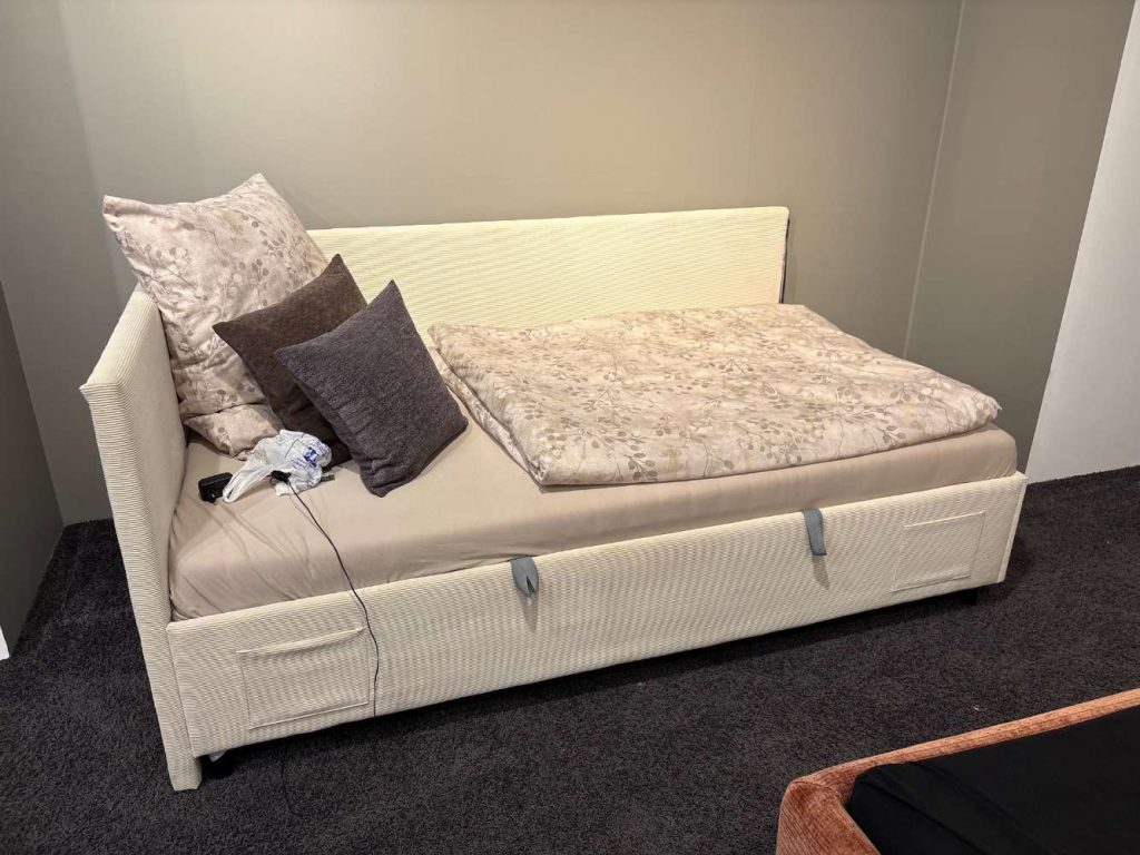 Mit den großzügigen Maßen von etwa 128x90x208 cm bietet das Bett ausreichend Raum für erholsamen Schlaf. Ein Highlight ist der praktische Bettkasten, der seitlich hochklappbar ist und somit zusätzlichen Stauraum für Bettwäsche oder Kissen bietet. Der integrierte Federholzrahmen unterstützt die Wendematratze optimal. Diese Matratze punktet mit einem 7-Zonen TTF500 System und ist in einem modernen H2/H3 Härtegrad gehalten, ideal für individuellen Schlafkomfort. Der feuchtigkeitsregulierende Comfort-Schaum sorgt für ein angenehmes Schlafklima während der Reißverschluss die Reinigung erleichtert. Mit dem inkludierten Rückenelement, das Komfort und Stil vereint, wird das Bett zum Hingucker und bietet zugleich eine bequeme Lehne für entspannte Lesestunden. Als Ausstellungsware vereint dieses Polsterbett Qualität und Design für stilbewusste Schlafgemächer.