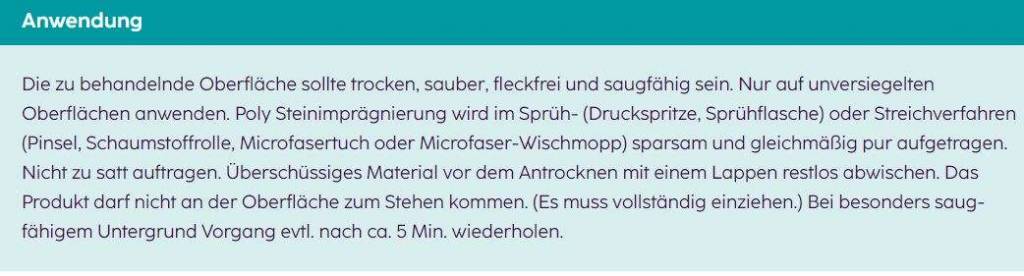 Ergiebigkeit / ca. 6-14 m² / L Die zu behandelnde Oberfläche sollte trocken, sauber, fleckfrei und saugfähig sein. Nur auf unversiegelten Oberflächen anwenden. Poly Steinimprägnierung wird im Sprüh- (Druckspritze, Sprüh­flasche) oder Streichverfahren (Pinsel, Schaumstoffrolle, Microfasertuch oder Microfaser-Wischmopp) sparsam und gleichmäßig pur aufgetragen. Nicht zu satt auftragen. Überschüssiges Material vor dem ­Antrocknen mit einem Lappen restlos abwischen. Das Produkt darf nicht an der Oberfläche zum ­Stehen kommen. (Es muss vollständig einziehen.) Bei ­besonders saug­fähigem Untergrund Vorgang evtl. nach ca. 5 Min. wiederholen.