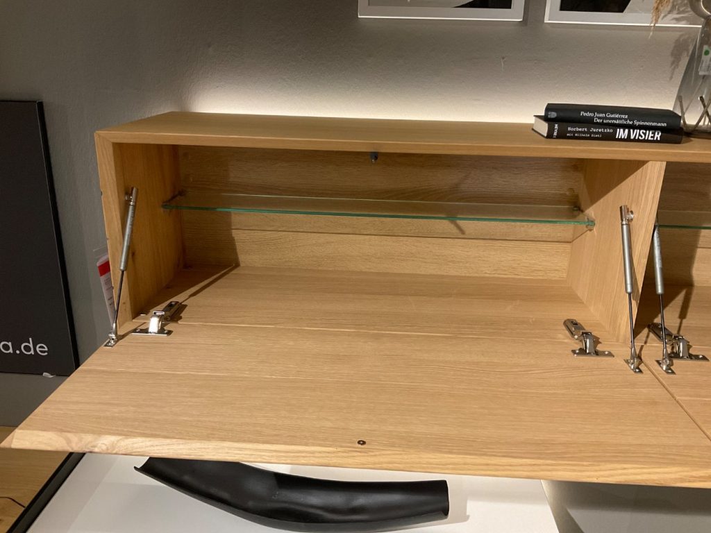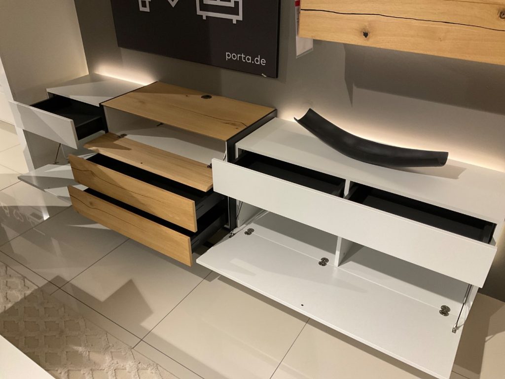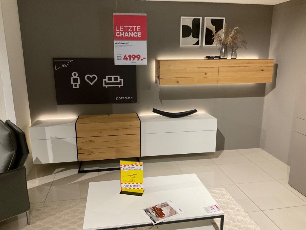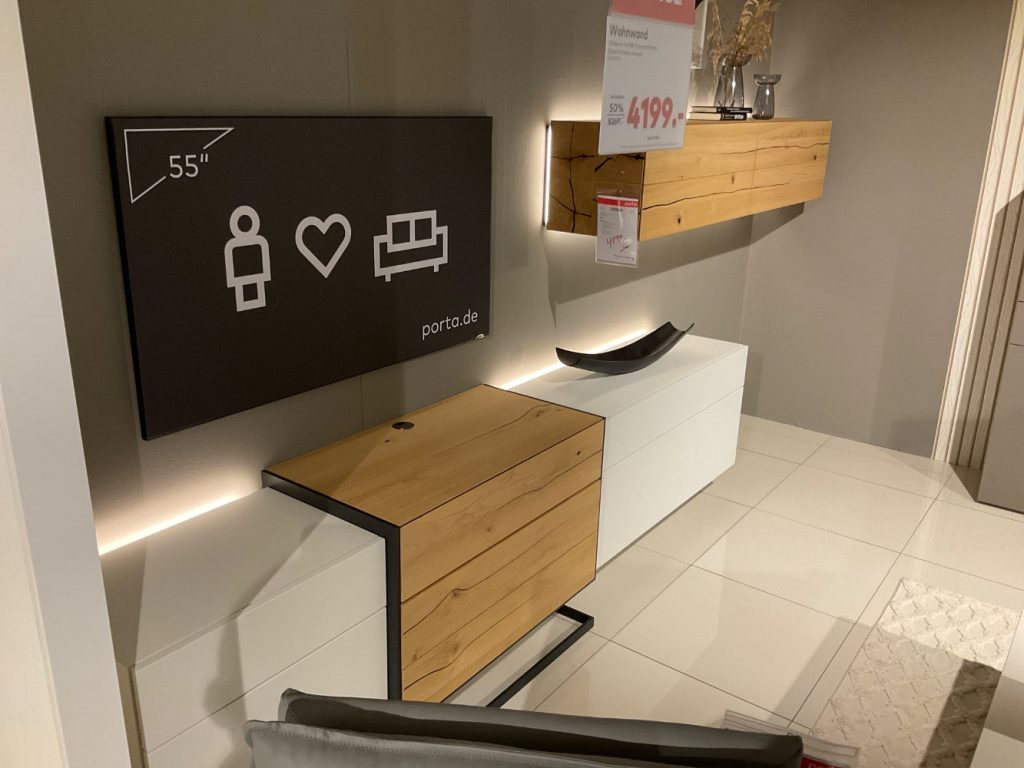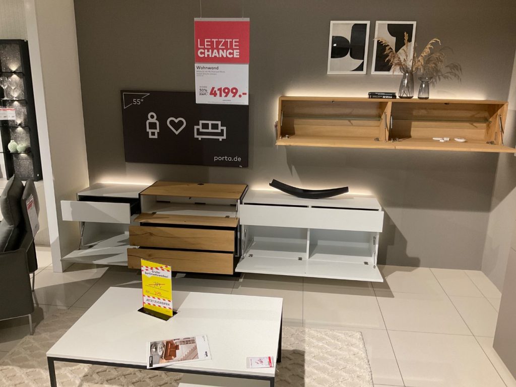 Bemerkung Wohnwand PURO, Wildeiche hell NB - Polarweiß Mattl. - Gestell Schiefer schwarz Da Ausstellungsstück sind leichte Gebrauchsspuren möglich. Die Ware kann bei Porta Möbel in Gütersloh besichtigt werden.