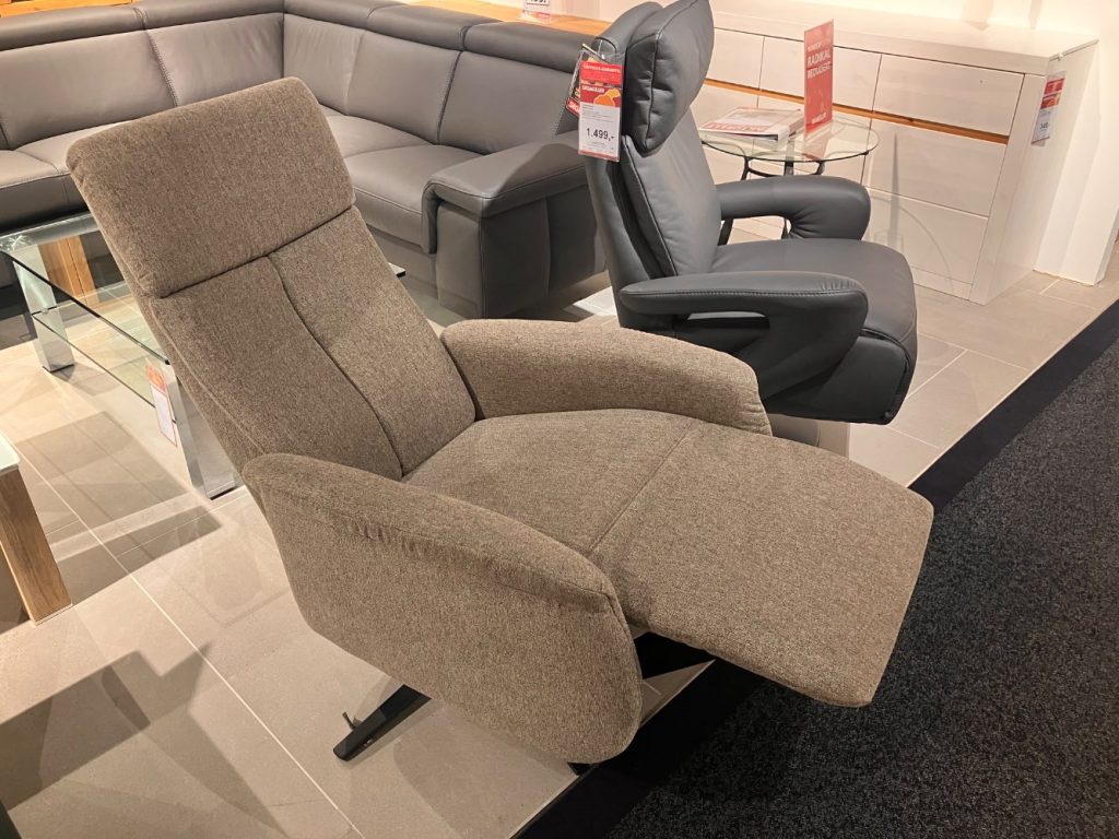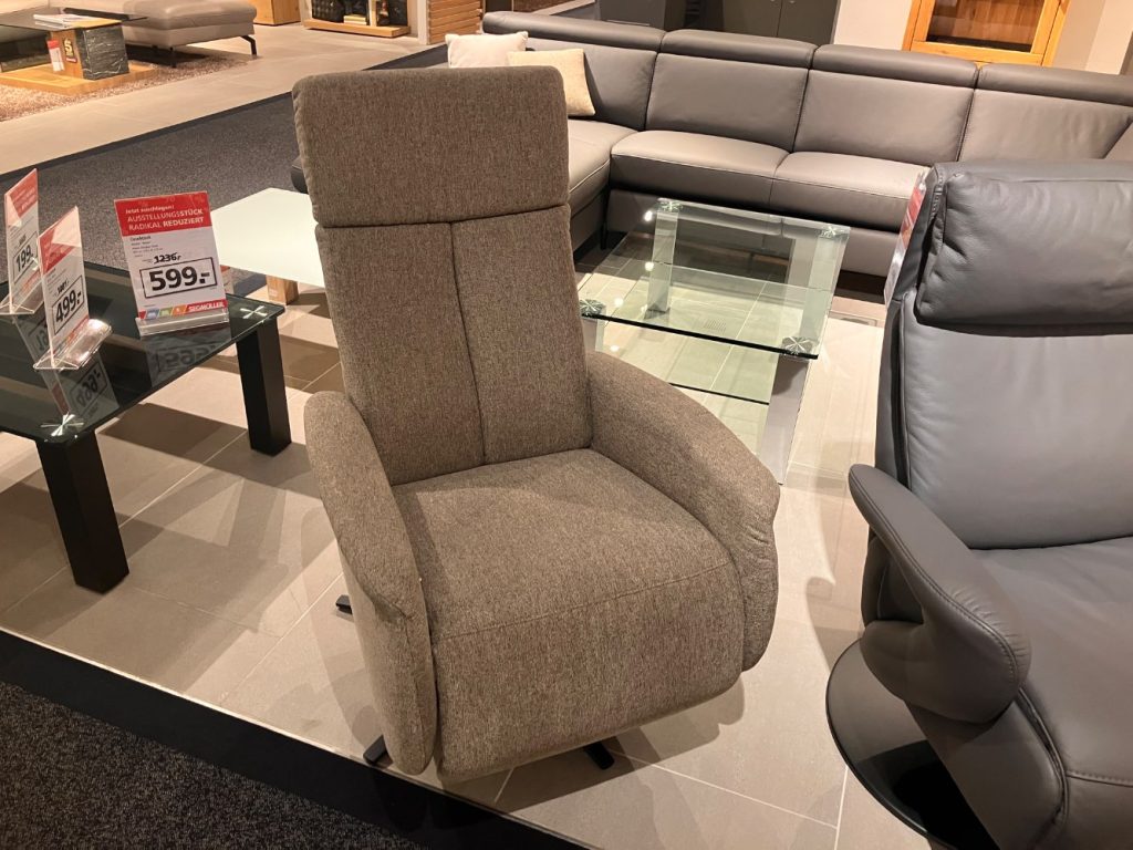 BemerkungDer Relaxsessel Riverside von CARINA vereint stilvolles Design mit außergewöhnlichem Komfort und ist die ideale Wahl für alle, die Wert auf Qualität und Ästhetik legen. Das Modell ist als Ausstellungsware konzipiert und zieht mit seiner eleganten Linienführung und hochwertigen Verarbeitung sämtliche Blicke auf sich. Der Sessel bietet ein einladendes Sitzerlebnis, das durch seine ergonomische Form unterstützt wird und zum Entspannen einlädt. Dank durchdachter Details und einer sorgfältigen Auswahl an Materialien stellt Riverside sicher, dass der Nutzer höchsten Komfort genießen kann. Dieser Relaxsessel ist nicht nur ein Möbelstück, sondern ein Statement für jeden Wohnraum, das Ihren individuellen Geschmack unterstreicht und dabei eine einladende Atmosphäre schafft. Mit dem Riverside erleben Sie Entspannung auf einem neuen Niveau, denn CARINA versteht es, Funktionalität und Design perfekt zu vereinen.