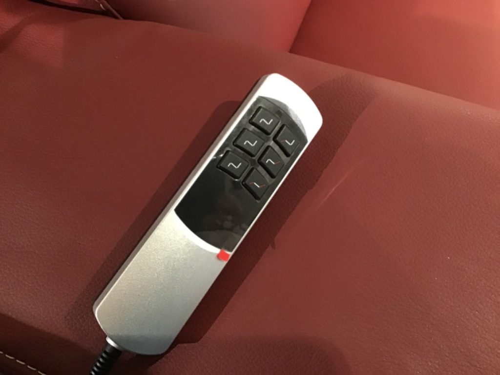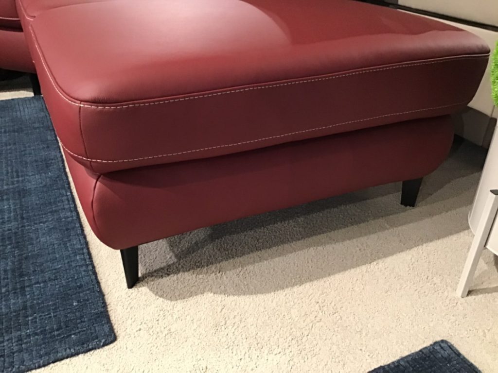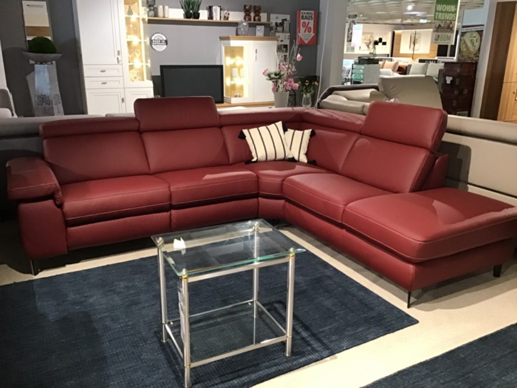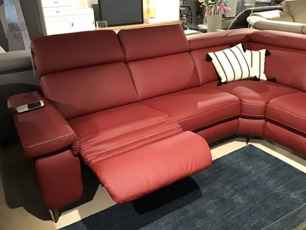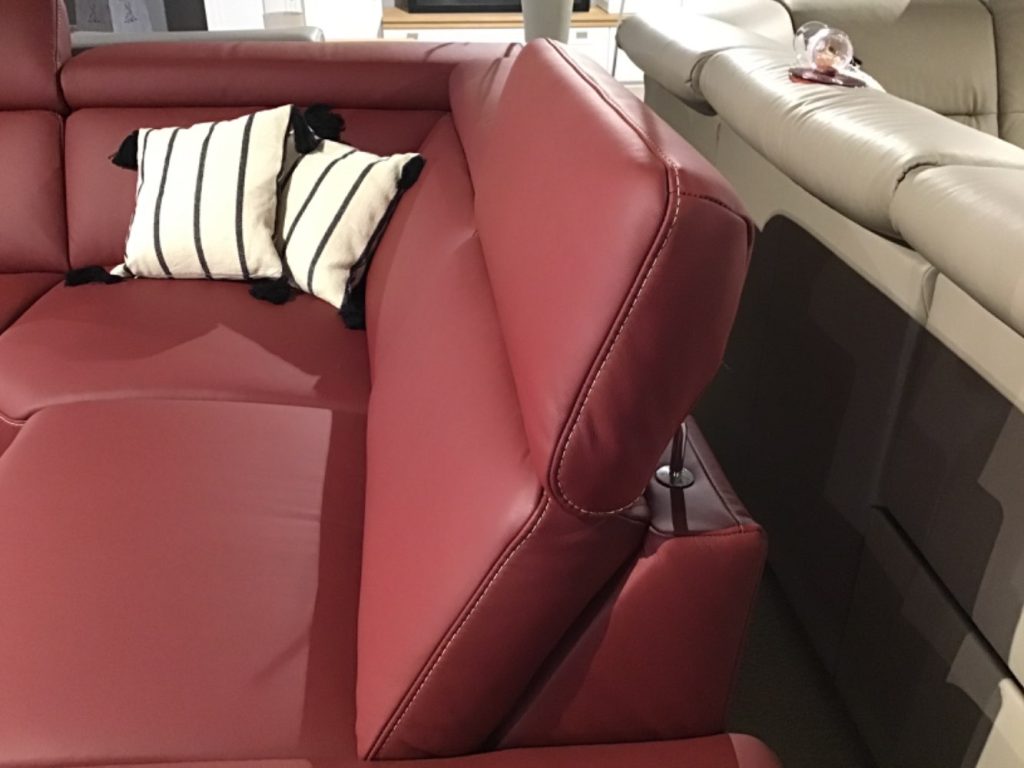 Bemerkung Moderne rote Ledergarnitur mit hellen Ziernähten und motorischer Verstellung