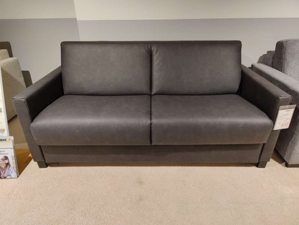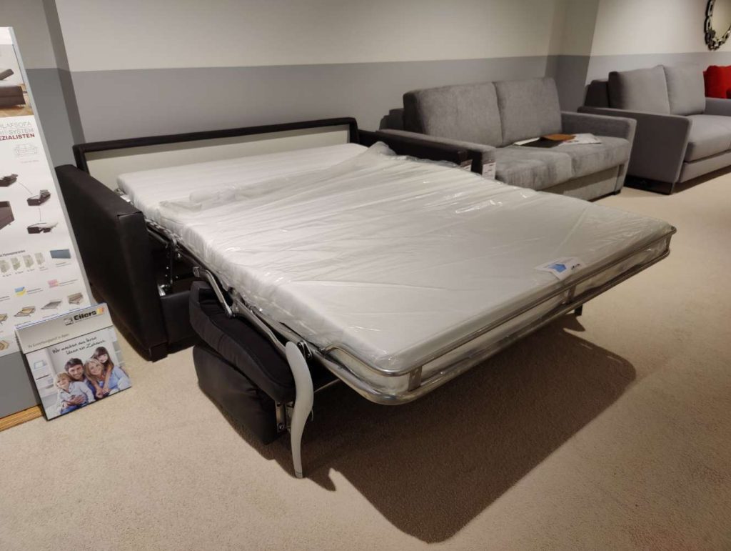 Das Möbelstück steht sicher auf schwarzen Füßen, die der Konstruktion eine moderne Note verleihen. Als Ausstellungsware ist das Modell Messina ideal für jene, die auf der Suche nach einem stilvollen und zugleich praktischen Schlafsofa sind, das sowohl tagsüber als auch nachts höchsten Ansprüchen gerecht wird.