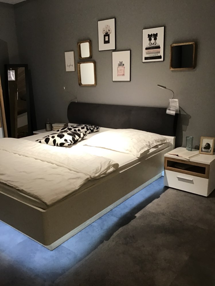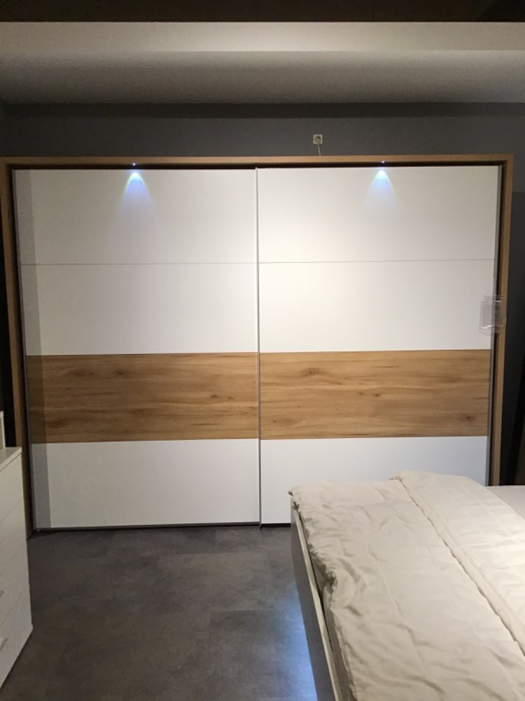 Schwebetürenschrank weiß mit Abs. Mauvella Oak BHT 269/210/62 Incl. Passepartout mit Beleuchtung Bettanlage 180x200 BHT 189/216/90 Nachtkommoden 52cm breit Kombikommode BHT 153/99/42cm