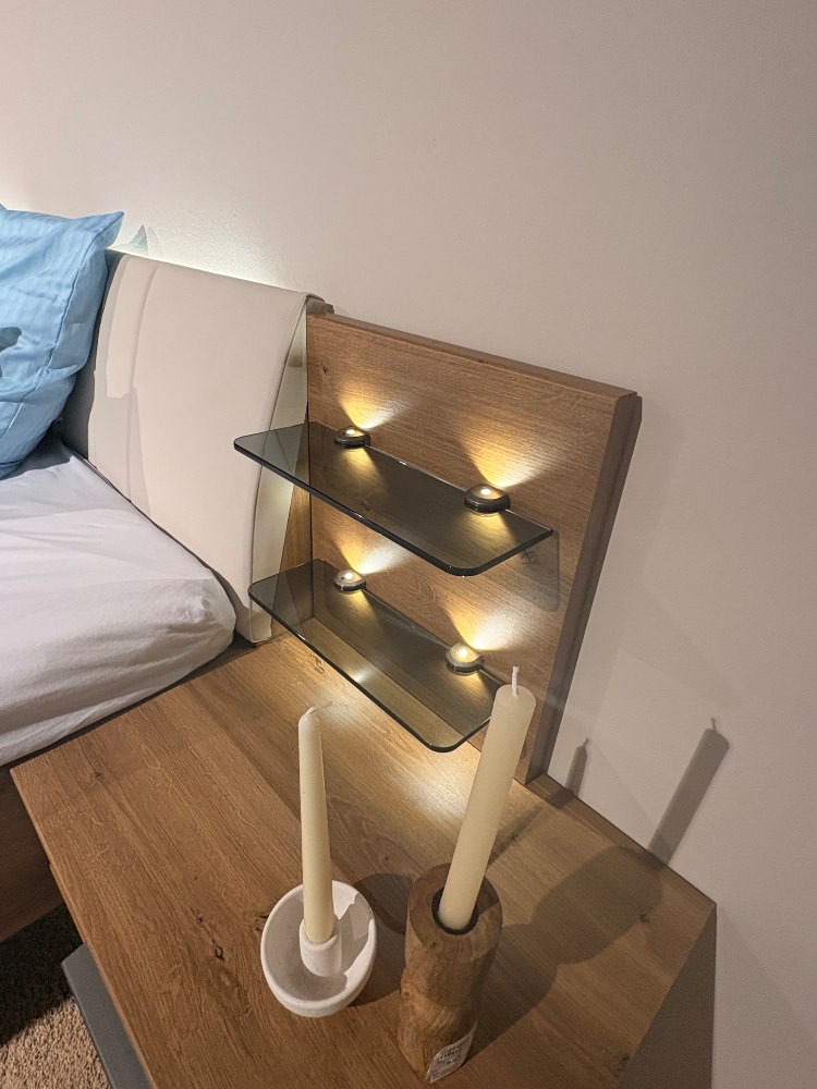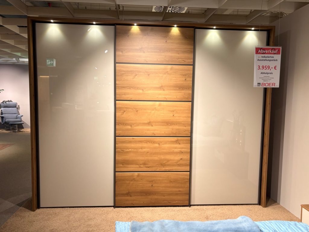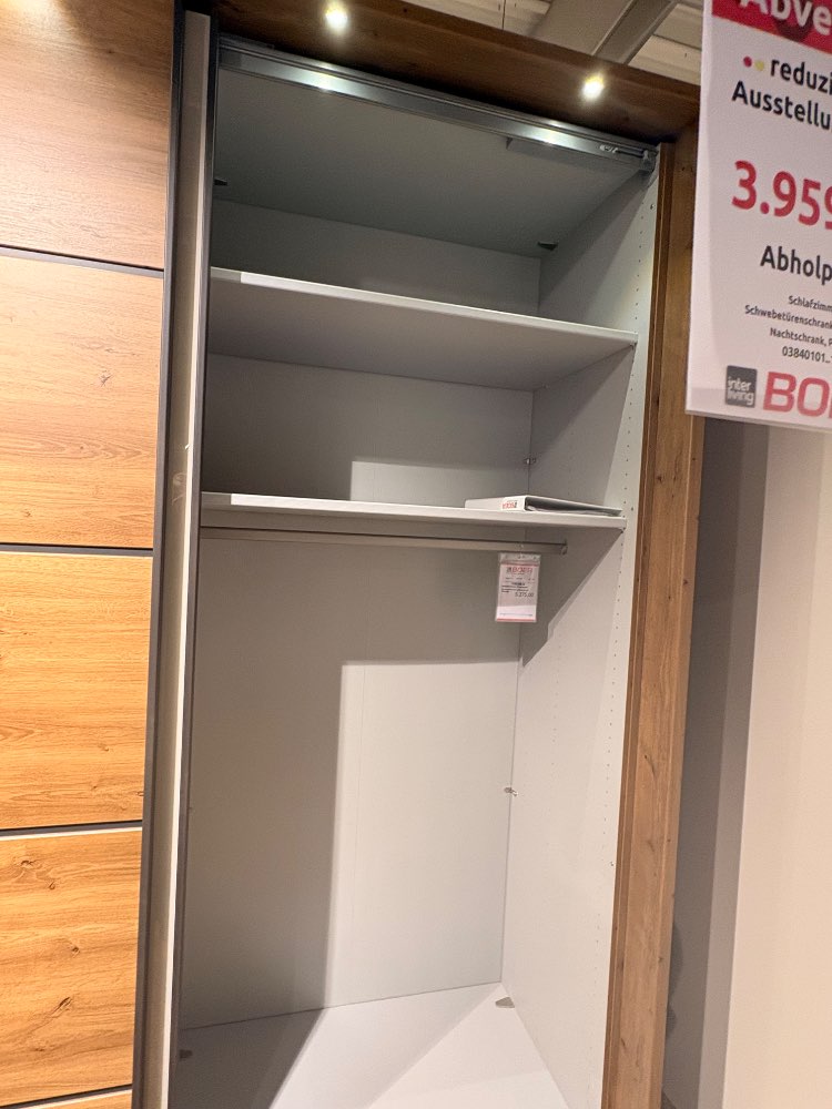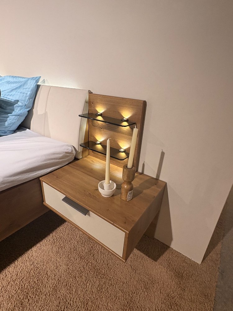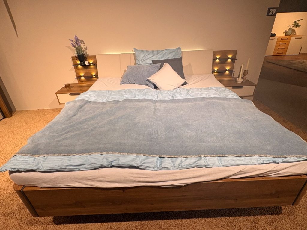 Schwebetürenschrank: BHT, 300 x 236 x 67cm Virginia Eiche Nachbildung Spiegel: Kristallspiegel 2 Einlegeböden, 1 Kleiderstange, 3 Türig Futon Bett Virginia Eiche NB Kopfteil: Kunstleder Champagner Fußteil Schwebend 4 Fache Liegehöhenverstellung 180x200cm Nachtschrank BHT: 60 x 48 x 43cm