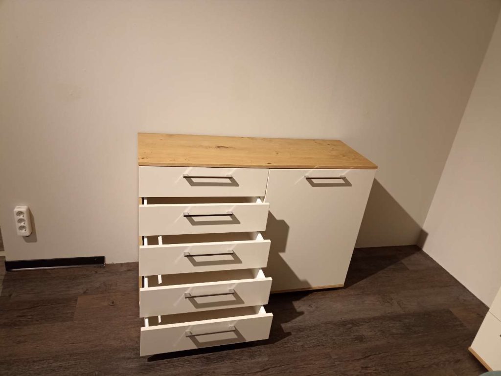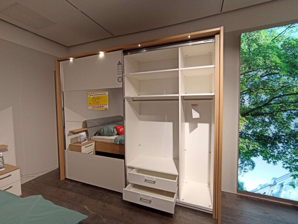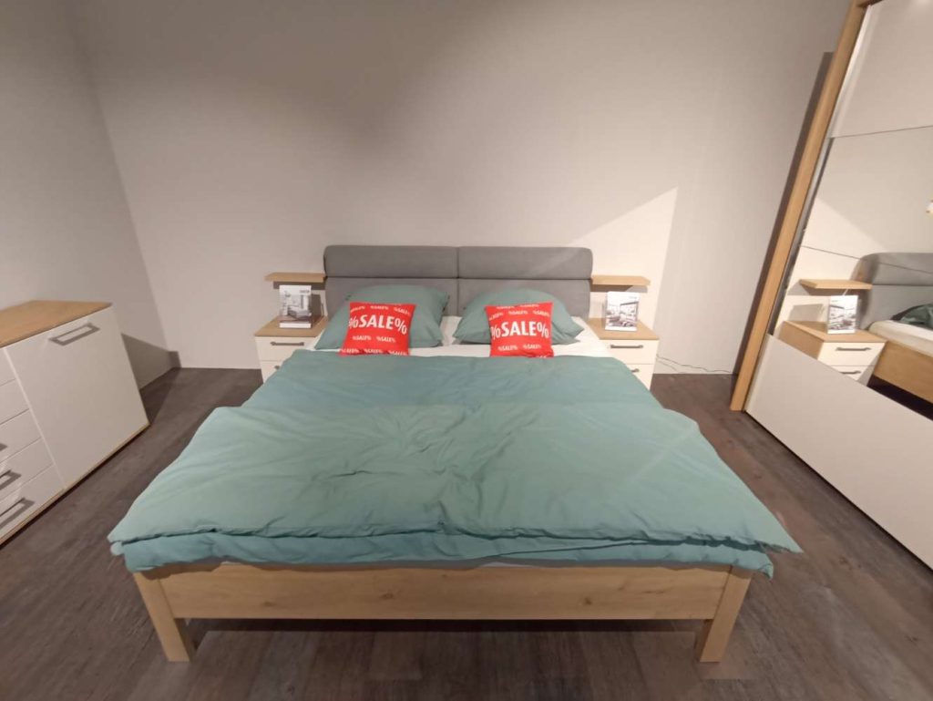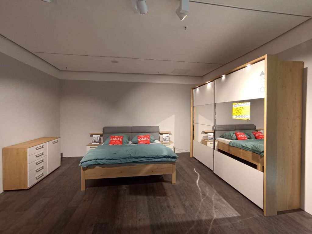 Kleiderschrank Balkeneiche / Lack Sand Fronttyp Schlicht / Innen Weiß 1x Schwebetürenschrank 2-türig mit 4 Spiegel-Kassetten 1x Passepartout 1x Power LED 4er Set 1x Innenschubkästen 2er-Set 1x Comfort-Set / T-Einteilung Bett mit Stollenliegenfußteil B/H/T ca. 89/105/222cm 1x Kopfteil Stoffbezug kieselgrau 1x Stoffabdeckung f. Fußteil & Bettseiten 2x Konsole mit 2 Schubkästen (B/H/T ca. 46/49/46 cm) 2x Wandsteckboard (B/H/T ca. 42/3/17 cm) Kommode Balkeneiche/ Lack Sand B/H/T ca. 120/82/46 cm 1x Kombikommode mit 5 Schubkästen & 1 Tür rechts inkl. Vollauszug