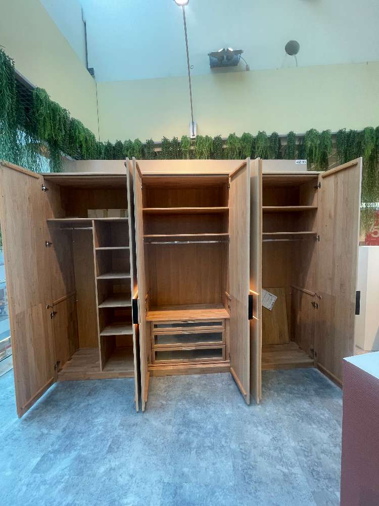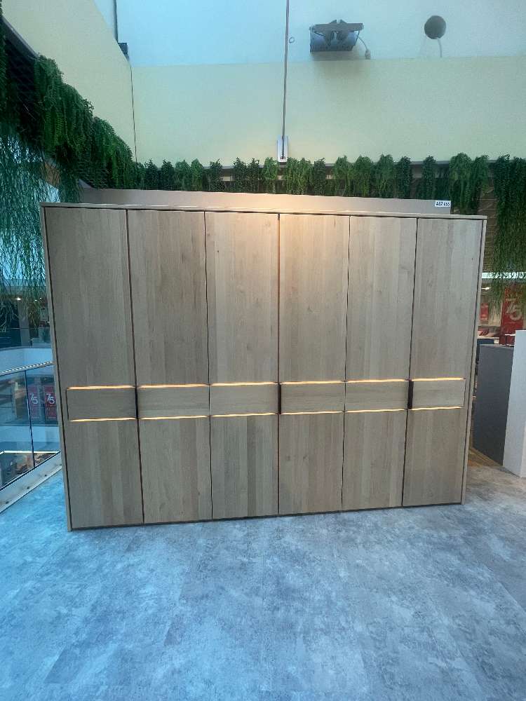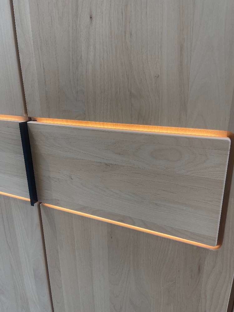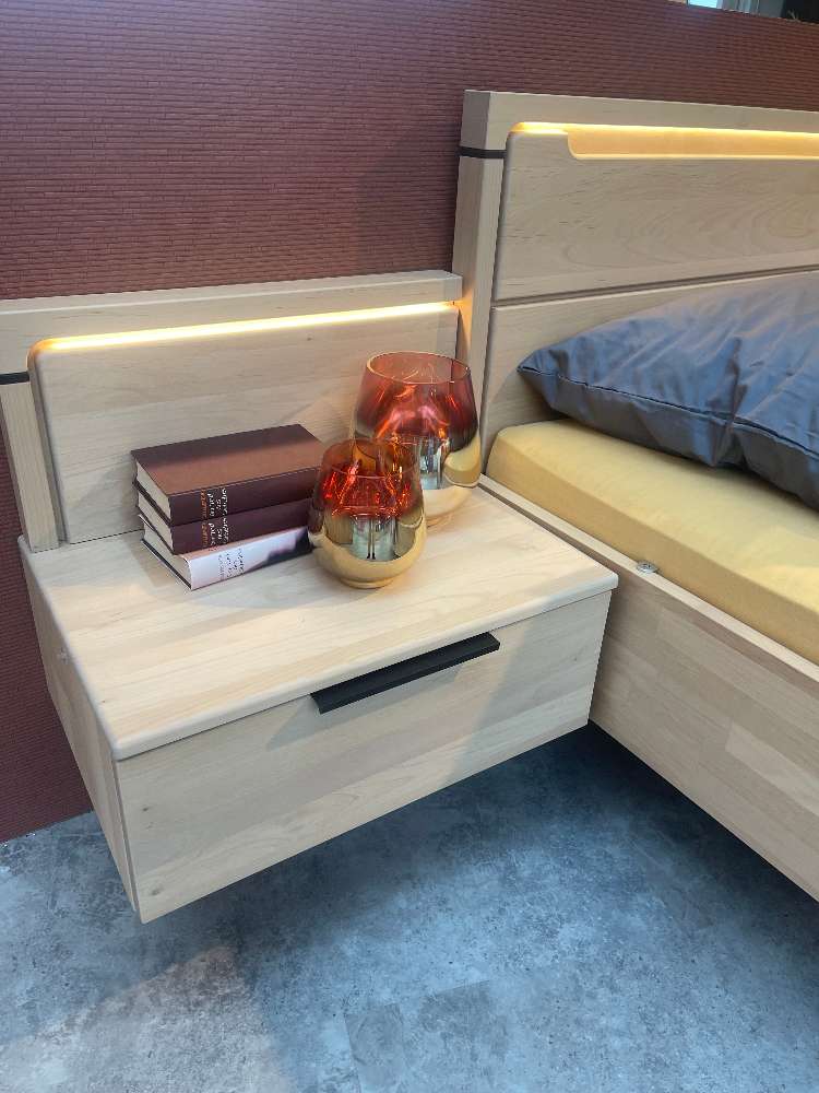 - Erle massiv natur geölt - Griff: Metall anthrazit - Liegefläche: ca. 180x200cm - Hängekonsolen mit Aufsatzpaneel - Drehtürenschrank B/H/T: ca. 302x223x59cm - inkl. Inneneinteilung und Beleuchtung
