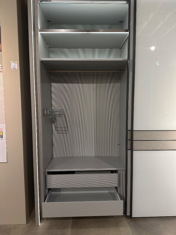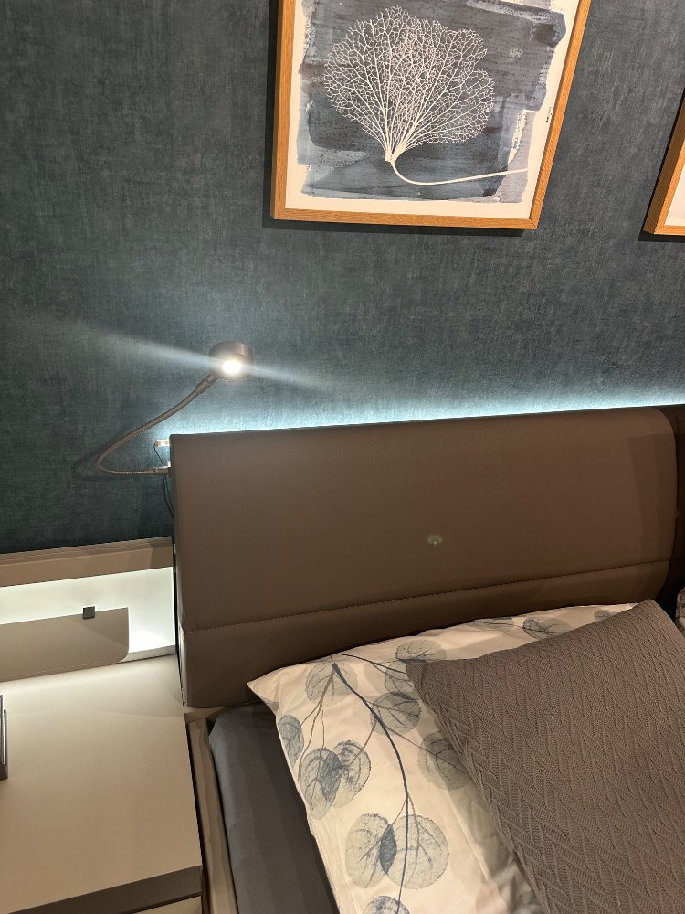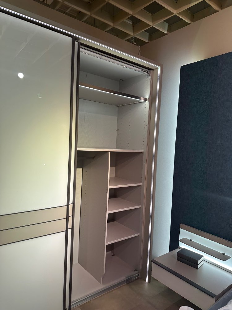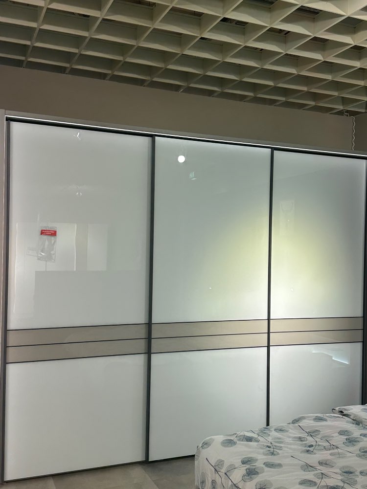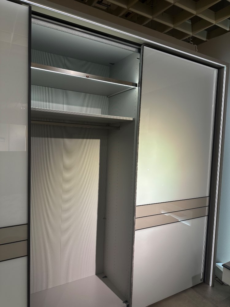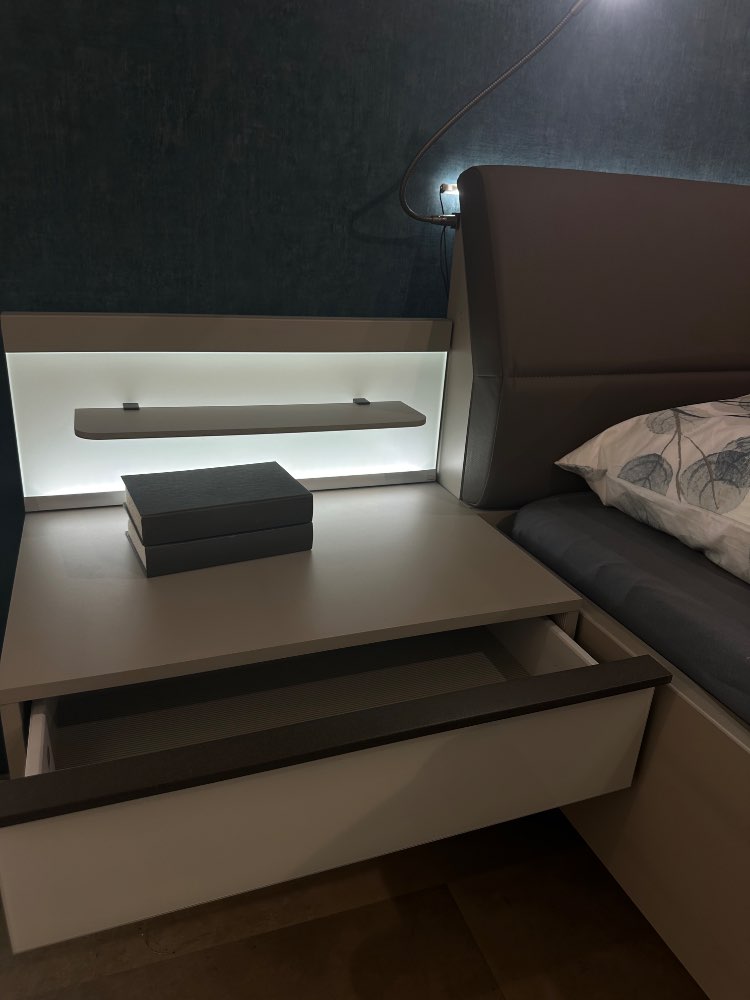 Bemerkung Schlafzimmer komplett bestehend aus: Bett Inkl. Nachtschränke in grau Stellmaß ca. 313x226, Liegefläche ca. 180x200cm, Kopfteil Inkl. Leselampen ca. 94cm hoch in Kunstleder grau, Nachtschränke Inkl. Beleuchtung in weiß, Kleiderschrank mit Schwebetüren aus Glas in weiß mit Absetzungen in grau BHT ca.300x236x67cm, mit 2 Schubkästen, Inkl. nützliche Gürtelablage, Passepartoutrahmen mit integrierter Beleuchtung, Innenbeleuchtung, Ohne Matratze, Lattenrahmen, Bettwäsche und Dekoration!