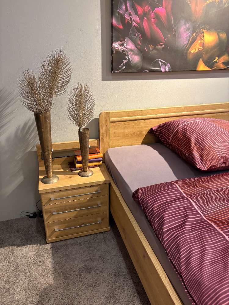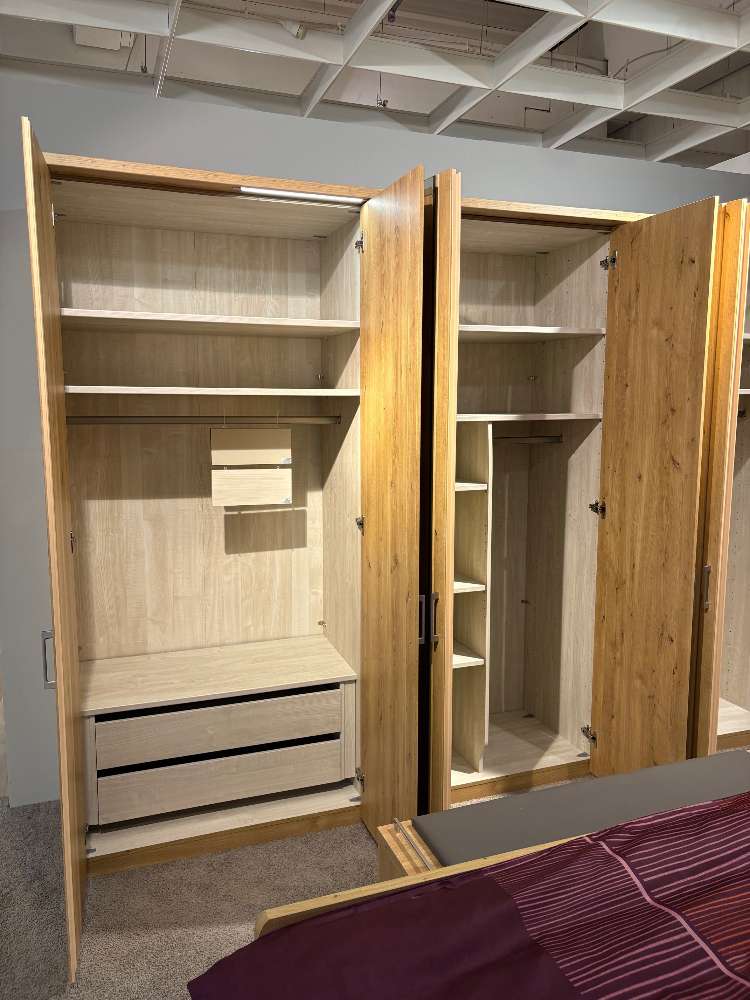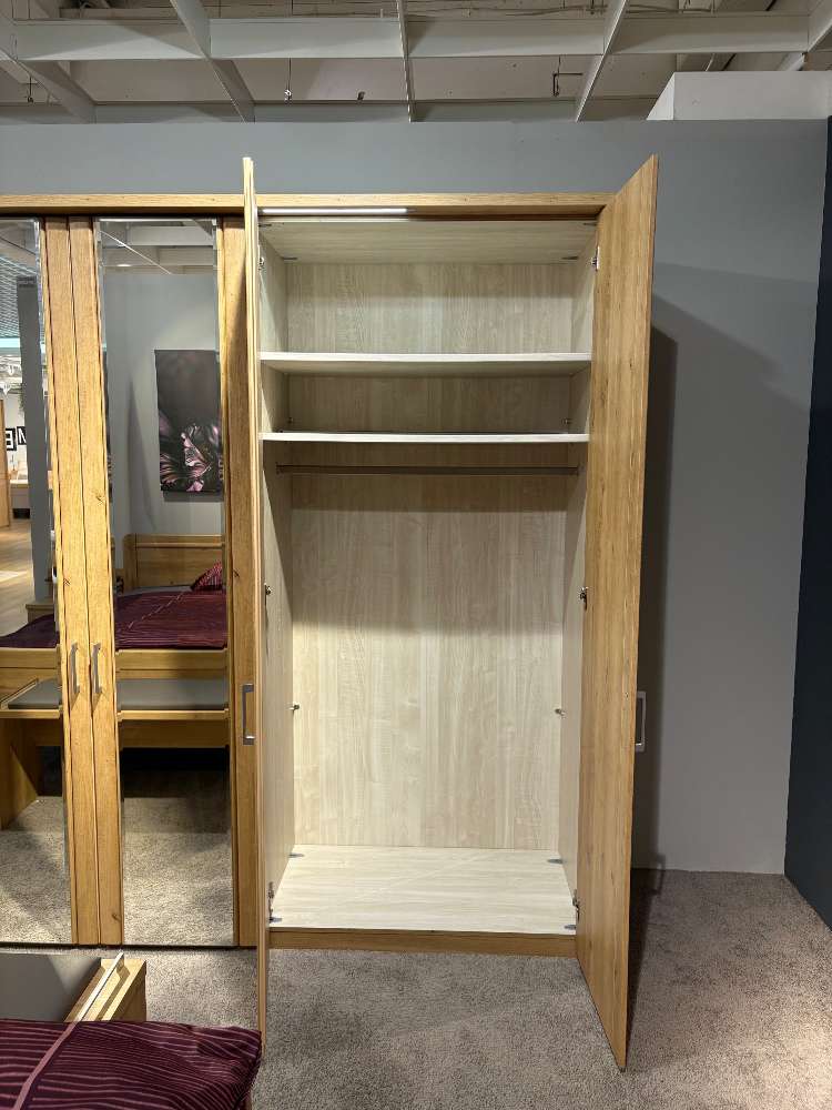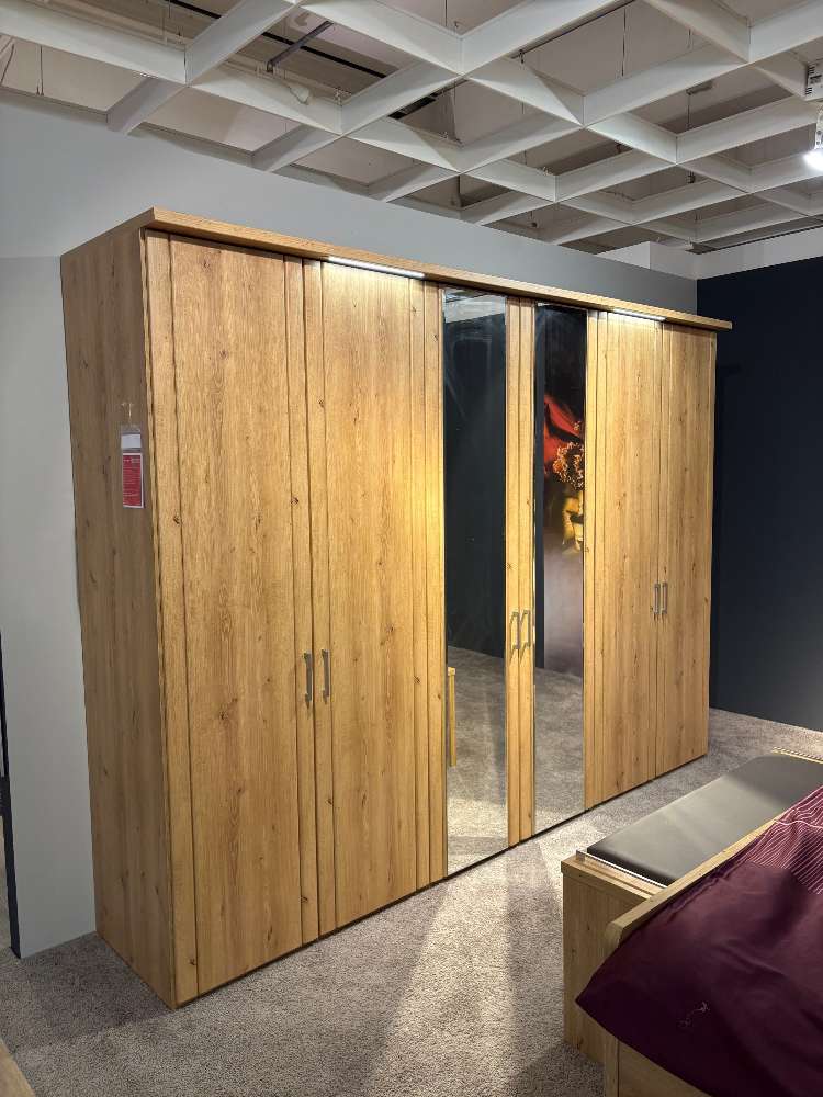 BemerkungDas Schlafzimmer-Set "Mainau" von OESEDER MÖBEL-INDUSTRIE in der eleganten Farbvariante "Eiche bianco" bietet eine perfekte Kombination aus Stil und Funktionalität. Die Ausstattung umfasst einen großzügigen Drehtürenschrank mit den Maßen von etwa 300x217x58cm und integriert zwei Spiegeltüren. Die edle Kranzleiste mit LED-Beleuchtung verleiht dem Raum eine stimmungsvolle Atmosphäre. Im Inneren des Schranks bieten Schubkasten- und Wäscheboden-Einsätze praktische Aufbewahrungsmöglichkeiten.