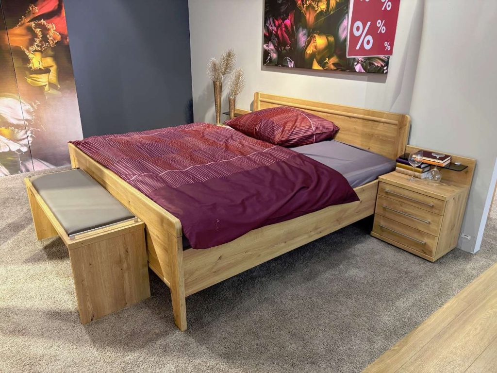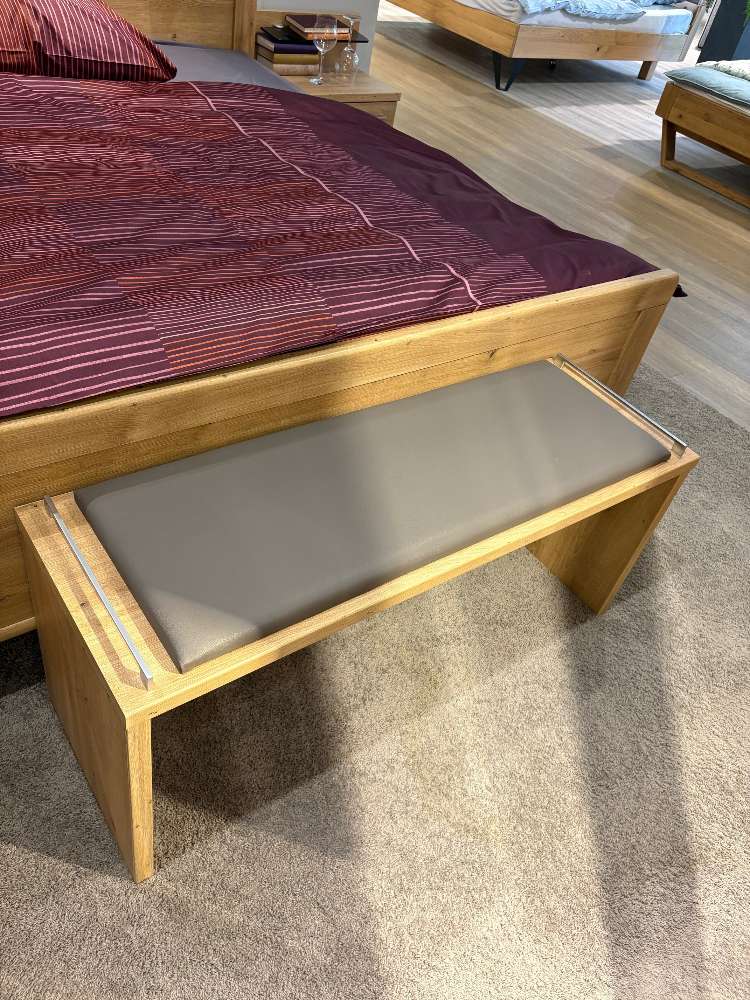 Das Bett mit Stollenfußteil hebt sich durch seine raffinierte Kopfteil-Beleuchtung hervor, die abendliche Lesestunden zu einem besonderen Erlebnis macht. Ergänzt wird das Ensemble durch ein Paar Nachtschränke, die mit 2,5 Auszügen und einem eleganten Nachttisch-Paneel zusätzlichen Stauraum bieten. Eine Ankleidebank, mit einer Breite von 120 cm und einem Sitzpolster in Kunstleder havanna komplettiert das Set und bietet eine komfortable Sitzgelegenheit beim Ankleiden. Dieses Ausstellungsstück vereint zeitlose Ästhetik und moderne Funktionalität.