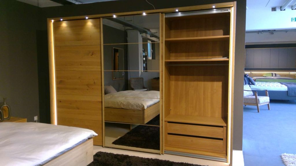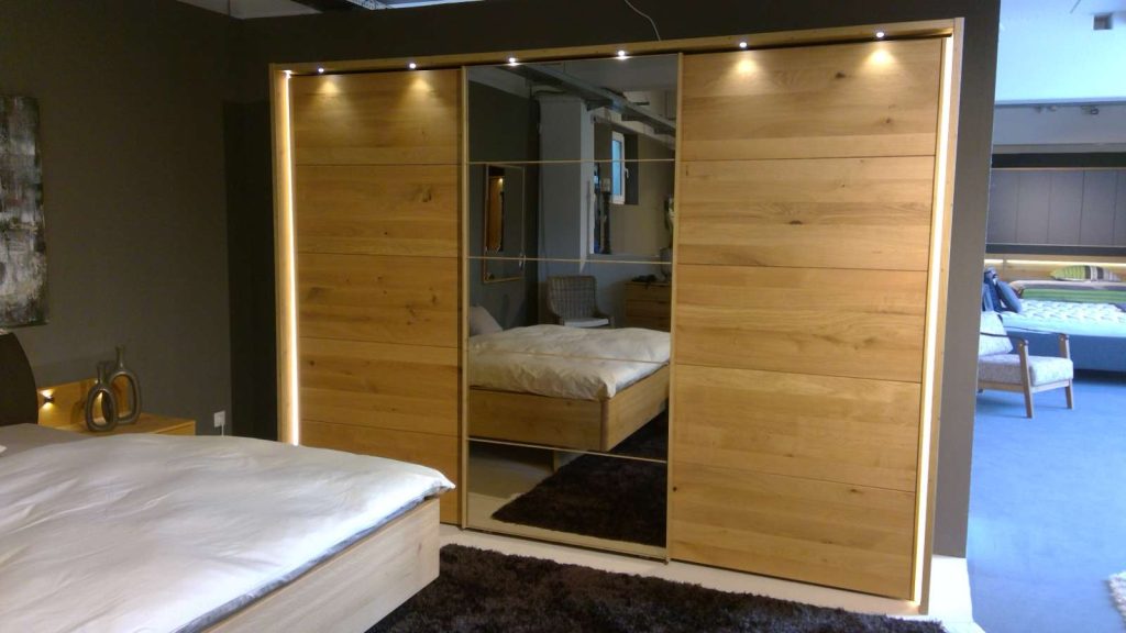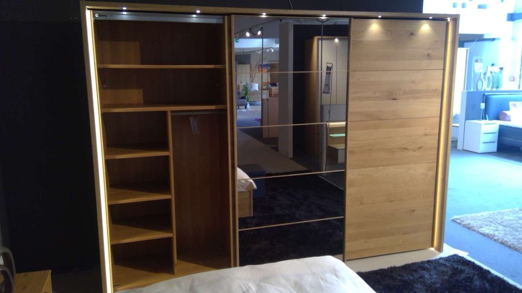 Schwebetürenschrank mit einer Spiegeltür Außentürdämpfer, Mitteltürdämpfer und Kollissionsdämpfer Passepartout-Rahmen mit LED Beleuchtung Wäschebodeneinsatz Schubkasteneinsatz LED-Lichtblende für Einlegeböden Stollenbeleuchtung LED-Ambientebeleuchtung für das Kopfteil Nachtschrank-Paneel mit LED Beleuchtung