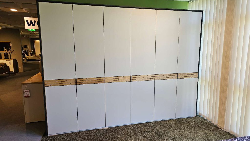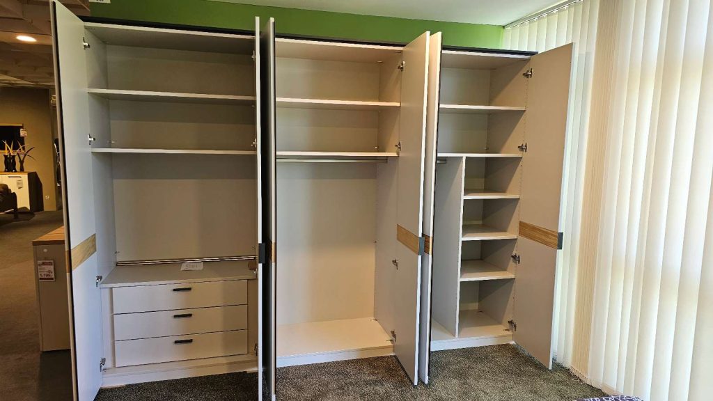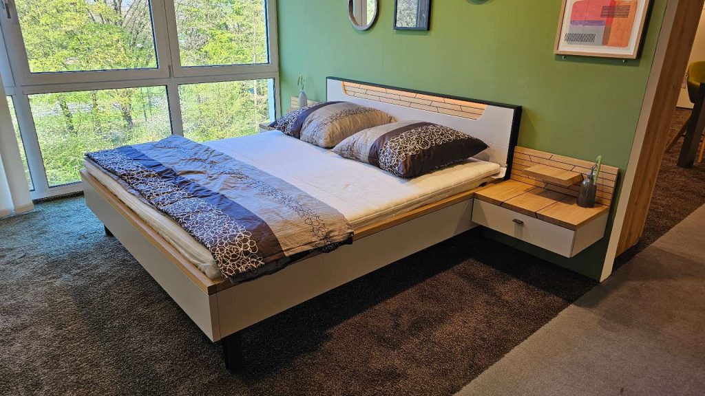 BemerkungDas INTERLIVING Modell 1030 Set 782010 verwandelt Ihr Schlafzimmer in einen Ort der Ruhe und Eleganz. Diese Ausstellungware besticht durch ihre harmonische Kombination aus lichtgrauem Mattlack und Akzenten aus Casa Wildeiche, die geölt sind. Das Komfort-Liegenbett mit Kopfteil in Blockstreifenfurnier bietet eine anpassbare Liegefläche von 180x200 cm, die vierfach höhenverstellbar ist. Mit einer eleganten Bettseitenhöhe von 48 cm und einer Kopfteilhöhe von 95 cm fügt sich das Bett stilvoll in jedes Interieur ein. Die zwei Hängekonsolen mit Schubkästen sorgen für zusätzlichen Stauraum und praktische Ablageflächen. Der großzügige, sechstürige Kleiderschrank mit Maßen von 302x223x62 cm bietet ausreichend Platz für all Ihre Garderobe. Er ist ausgestattet mit Einlegeböden und Kleiderstangen, die von einem Mittelriegel mit Blockstreifenfurnier abgerundet werden. Extrakomponenten wie Beleuchtungssets, Aufsatzpaneele und ein Passepartoutrahmen verleihen diesem Set zusätzlichen Komfort und eine persönliche Note. Die Griffe und Füße in schiefer-schwarzer Lackierung unterstreichen das moderne Design. Dieses Ensemble schafft eine Atmosphäre voller Wärme und Wohnlichkeit, ideal für Ihr persönliches Rückzugsgebiet.