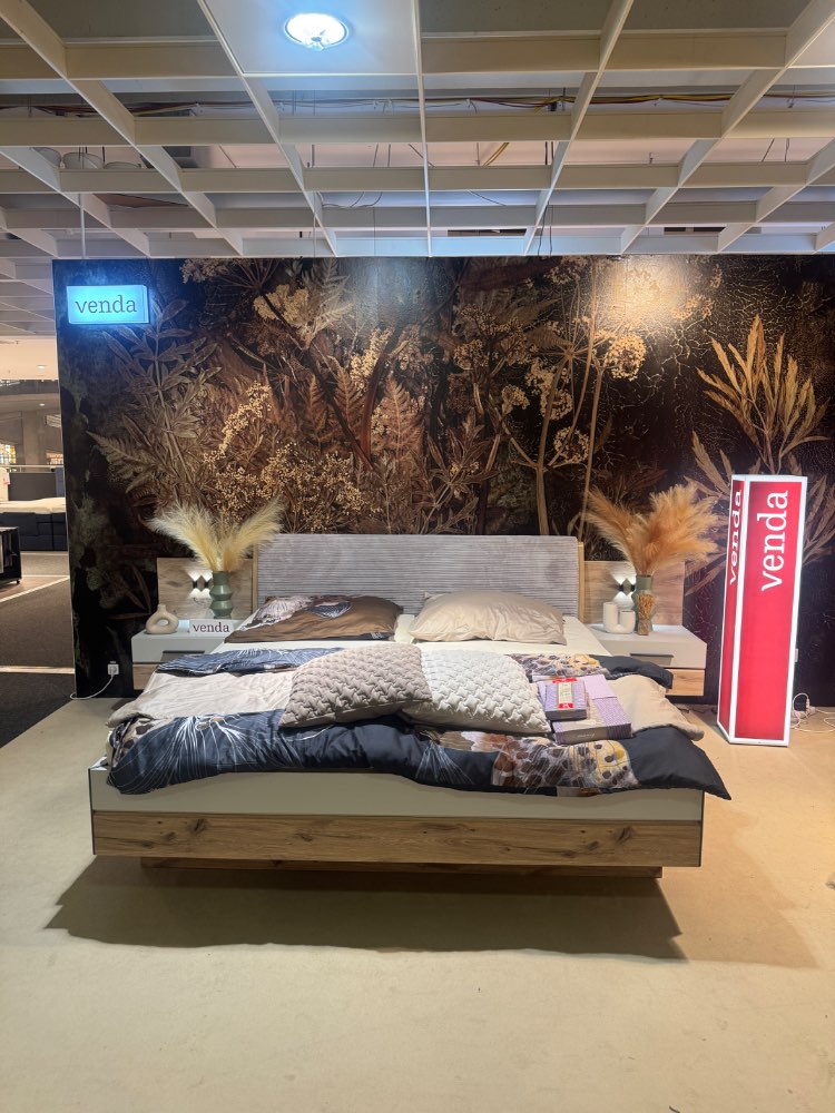 Schlafzimmer bestehend aus Schwebetürenschrank 270x225x60 in Eichefarben/Hellgrau und einer Bettanlage mit Liegefläche 180x200