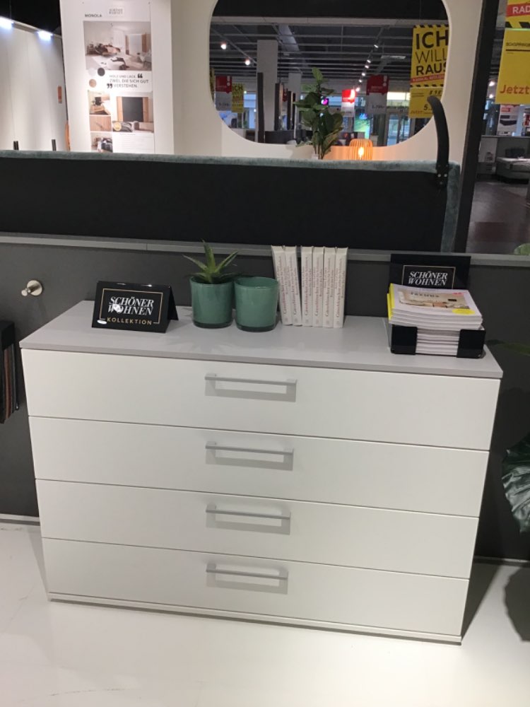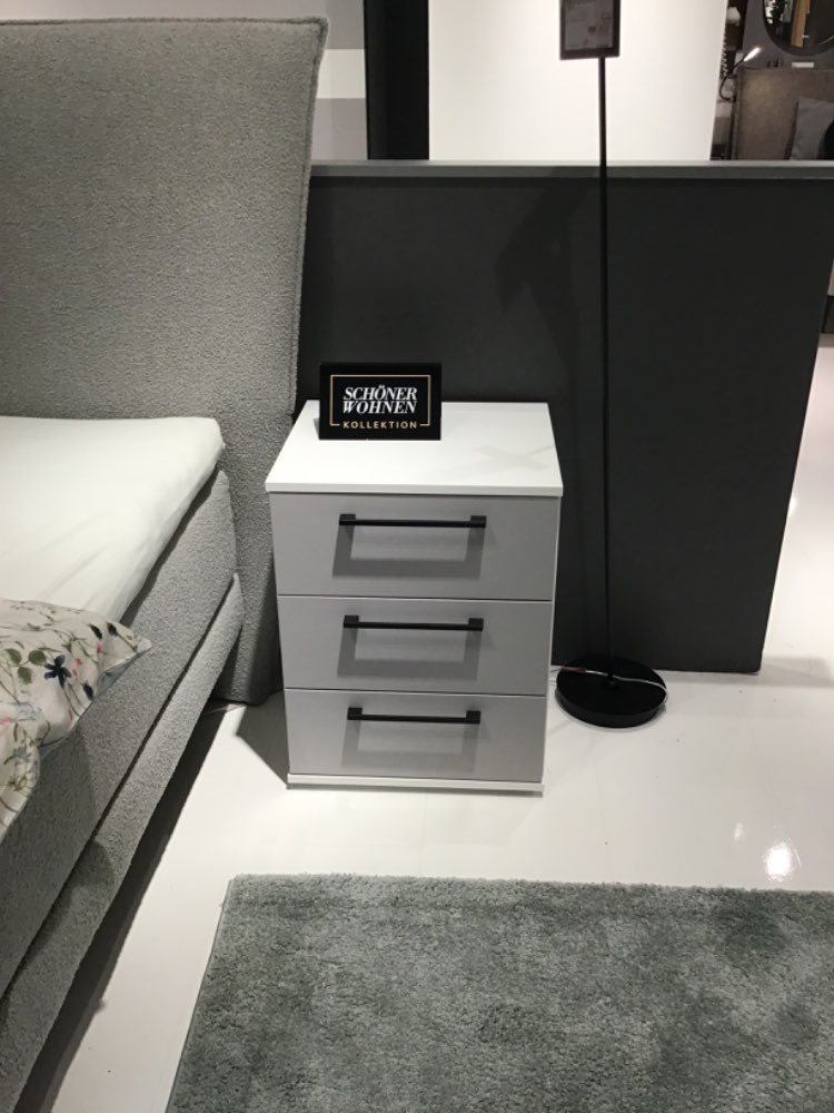 Schlafzimmerschrank:B271 H230 T68 cm Bett: LF 180x200 Kommode: B120 H82,5 T46 Farbe: Front Lack Satingrau Farbe: Korpus Lack Weiß Griffe: Anthrazit