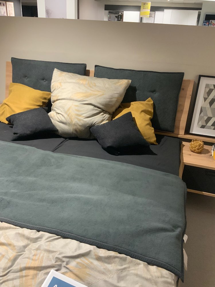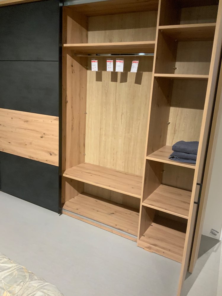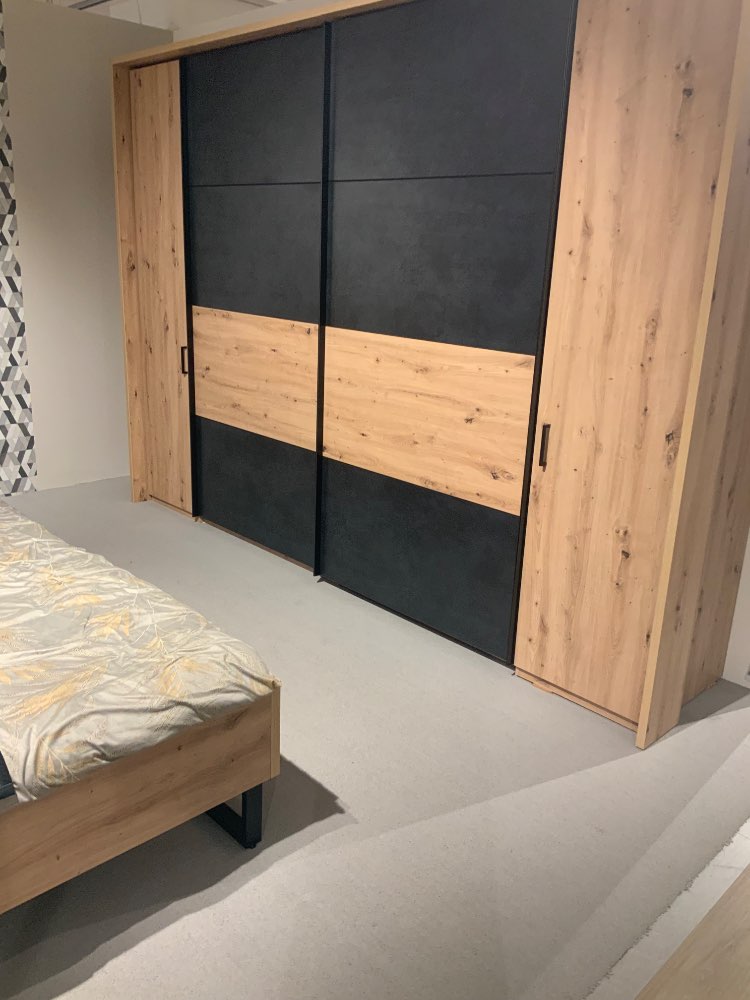 Kleiderschrank ca 293/226/67 cm, Bettanlage mit 2 Nachtkonsolen, 1 Kommode ca 154/94/38 cm, Ausf. Korpus/Front Artisan Eiche NB, Abs. Terra Mater Schwarz, ohne Rahmen u. Matratzen