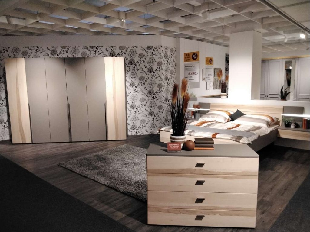 AusführungLack Fango/ Kristallbuche massiv, bestehend aus: Drehtürenschrank 6-trg. ca. 298x222x62 cm, Bett mit Liegefläche ca. 180x200 cm, zwei Hängekonsolen mit je 1 Schub ca. 65x20x46 cm und Kommode mit 4 Schüben ca. 116x81x46 cm inkl. LED-Glasbodenbeleuchtung und Zubehör