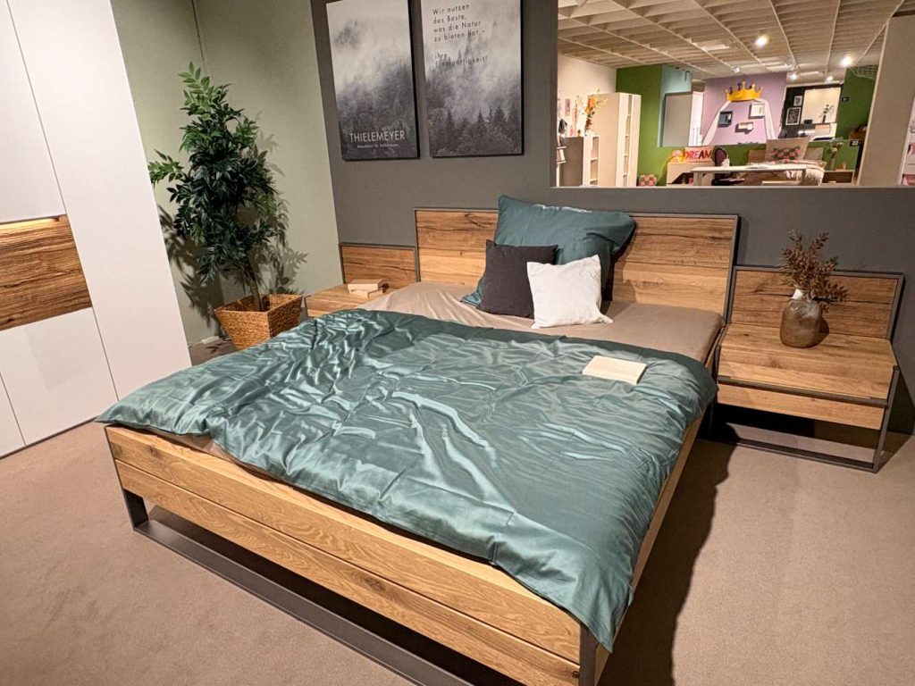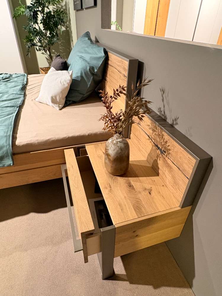 Wildeiche massiv gebürstet Material variante Titan absetzung Spaltholz Bettseite und Fußteilhöhe 46cm