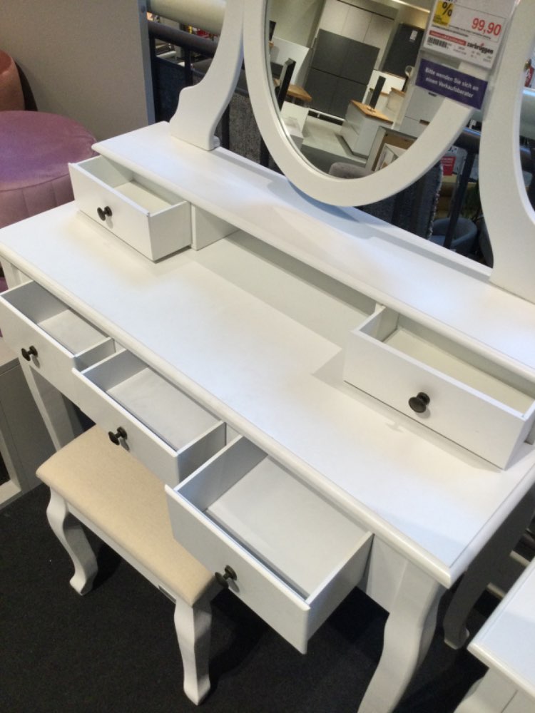 BemerkungDie Konsolentisch Clara vereint stilvolle Eleganz mit praktischer Funktionalität und wird somit zum idealen Begleiter in jeder modernen Einrichtung. Mit ihrem verstellbaren Spiegel bietet sie nicht nur vielseitige Einsatzmöglichkeiten, sondern passt sich auch flexibel Ihren individuellen Bedürfnissen an. Die klare, geradlinige Formgebung verleiht dem Design eine zeitlose Ästhetik, die sich harmonisch in unterschiedlichste Wohnstile integriert.