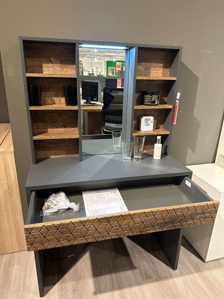 BemerkungDas Ausstellungsstück Leone von BEGA-Consult vereint modernes Design mit funktionalem Komfort und ist die ideale Ergänzung für jedes Badezimmer. In einem eleganten Graphit-Ton kombiniert mit der warmen Optik von Ribbeck Eiche bietet dieser Badschrank sowohl Stil als auch Stauraum in den Maßen von ca. 93 x 147 x 40 cm. Die integrierte LED-Beleuchtung setzt Ihre Badezimmerutensilien perfekt in Szene und sorgt für eine angenehme Atmosphäre. Der Schrank verfügt über einen geräumigen Stauraum mit einer Soft-Klappe und zwei offene Fächer, die jeweils mit drei Böden ausgestattet sind, um Ihre Pflegeartikel und Handtücher ordentlich zu verstauen. Der inbegriffene Spiegel verleiht Ihrem Badezimmer eine optische Großzügigkeit und Helligkeit. Dank der Push-to-open-Funktion lassen sich die Türen sanft und ohne Griffe öffnen, was das minimalistische Design unterstreicht und die glatten Flächen perfekt akzentuiert. Dieses Möbelstück ist nicht nur ein Blickfang, sondern auch eine praktische Lösung für Ihr Badezimmer.