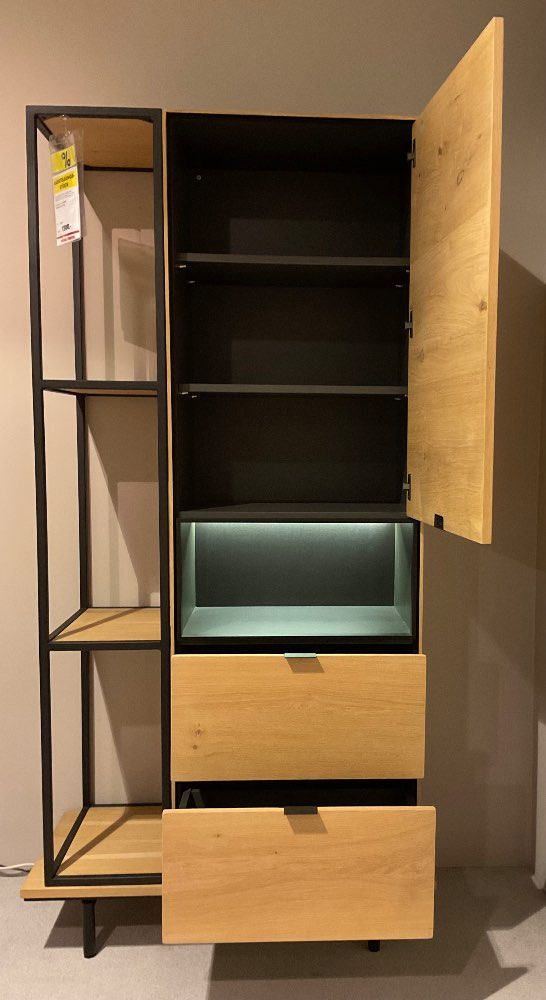 Natur Eichenholz, Fb. naturell, 1 Tür, 2 Auszüge, 1 offener Fach mit LED-Beleuchtung, 1 Regalteil, Ca. 100 x 200 x 46 cm