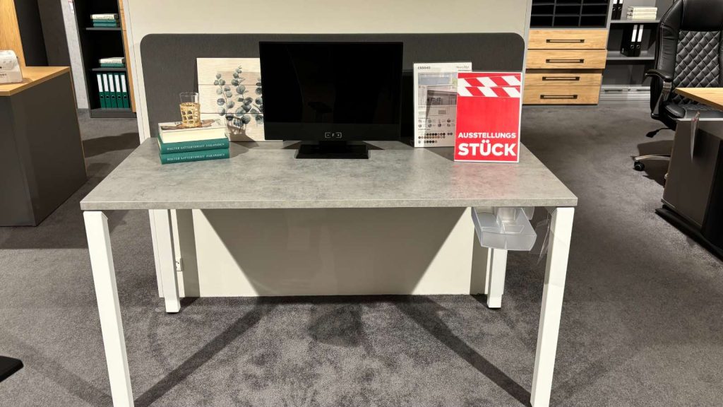 Bemerkung Schreibtisch "Lis" B/H/T ca. 140/75/70 cm Tischplatte u. Kante Light Grey Gestell RAL 9016 / Kabeld. li+re weiß Schreibtischpaneel "Lis" B/H/T ca. 140/48/5cm Paneel mit Stoff bezug Era CSE13 Halterung RAL9016 Traffic white Stiftablage "Daniel 1" B/H/T ca. 30/5/14 Kunststoff transparent / Montage unter Tischplatte, schwenkbar
