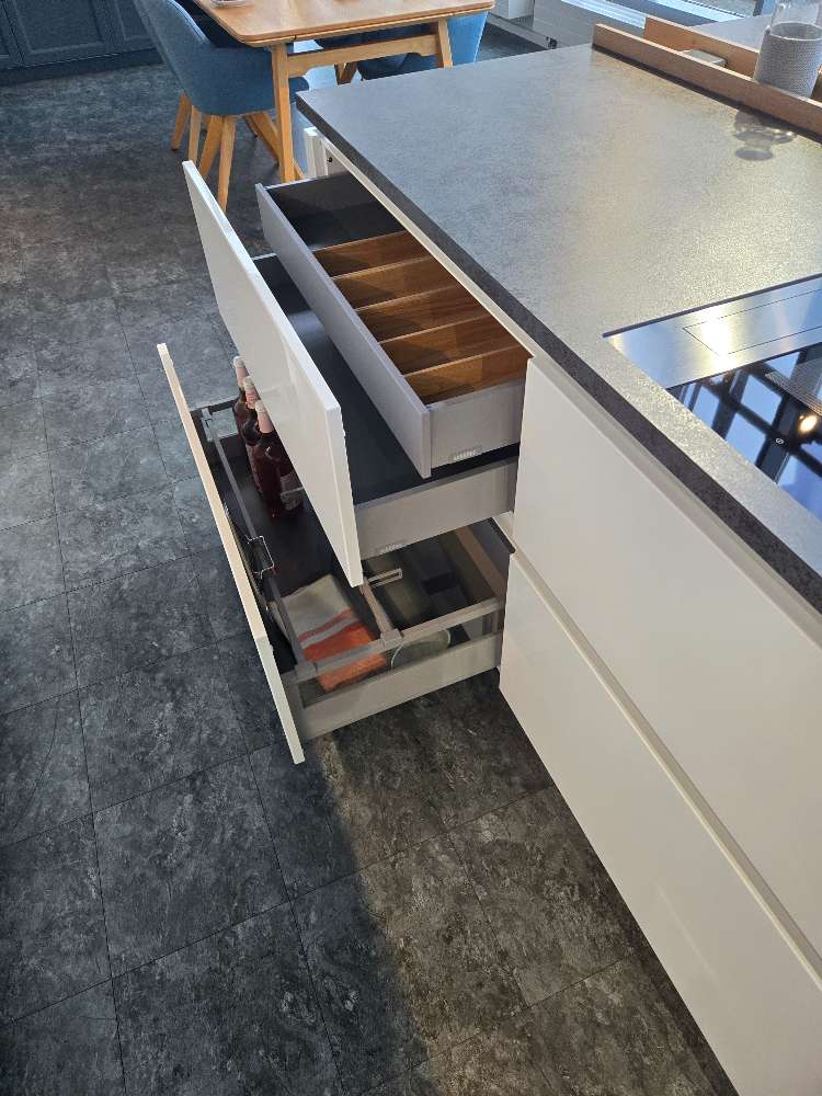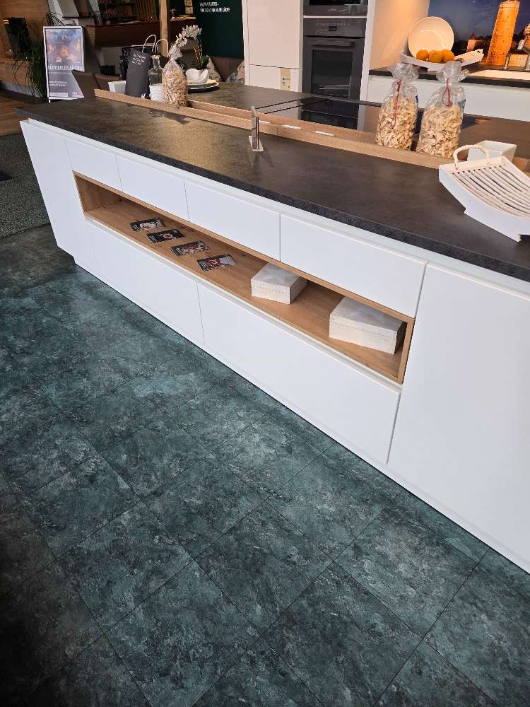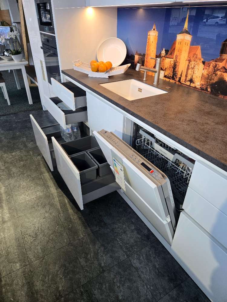 Bemerkung Schüller Gala Küche - Moderne Küche mit Insel Kristallweiß Hochglanz Erleben Sie moderne Küchenästhetik und höchste Funktionalität mit der Schüller Gala Küche in Kristallweiß Hochglanz – ein echtes Highlight für anspruchsvolle Genießer und Designliebhaber. Starten Sie den Tag mit einem perfekten Espresso, Cappuccino oder Latte Macchiato auf Knopfdruck. Der elegant verbaute Vollautomat bietet höchsten Komfort und fügt sich nahtlos ins Küchendesign ein. Der integrierte Kombidampfgarer ermöglicht schonendes Garen mit Dampf, Backen und Braten in einem Gerät. Ideal für alle, die Wert auf gesunde Ernährung und perfekten Geschmack legen. Diese moderne Küche überzeugt mit Ihrem Design und dem vielen Stauraum. Trotz Ihrer Größe wirkt Sie offen und einladend mit viel Arbeitsfläche und top Ausstattung.