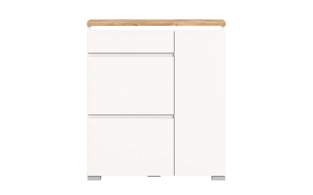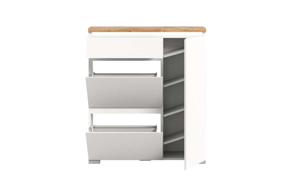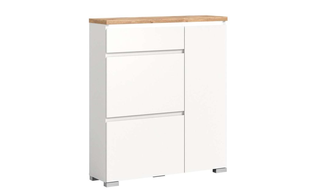 BemerkungAusführung mit Korpus und Front aus FSC®-zertifiziertem Holzwerkstoff in weiß, mit Oberboden in Nox Oak Nachbildung, Füße aus Kunststoff in silberfarbend, 2 Klappfächer, 1 Schubkasten mit Metallführung, 1 Tür mit Dämpfung, 4 schräg gestellte Einlegeböden für Schuhe bis Größe 45, griffloses Design, ohne Beleuchtung, B/H/T ca. 95 x 109 x 27 cm.
