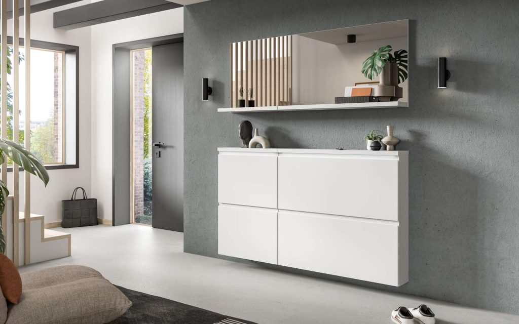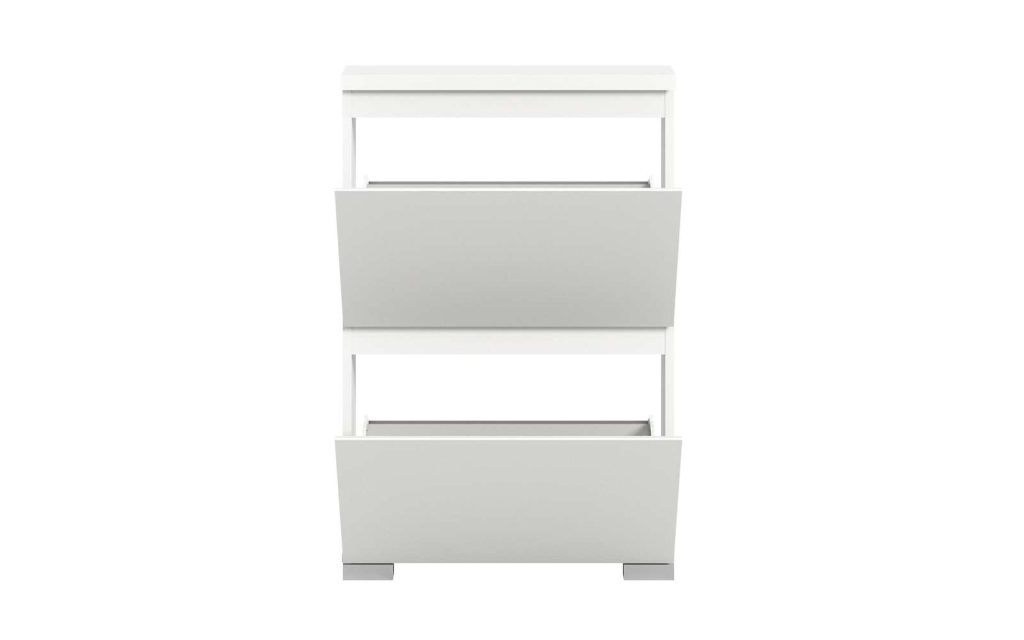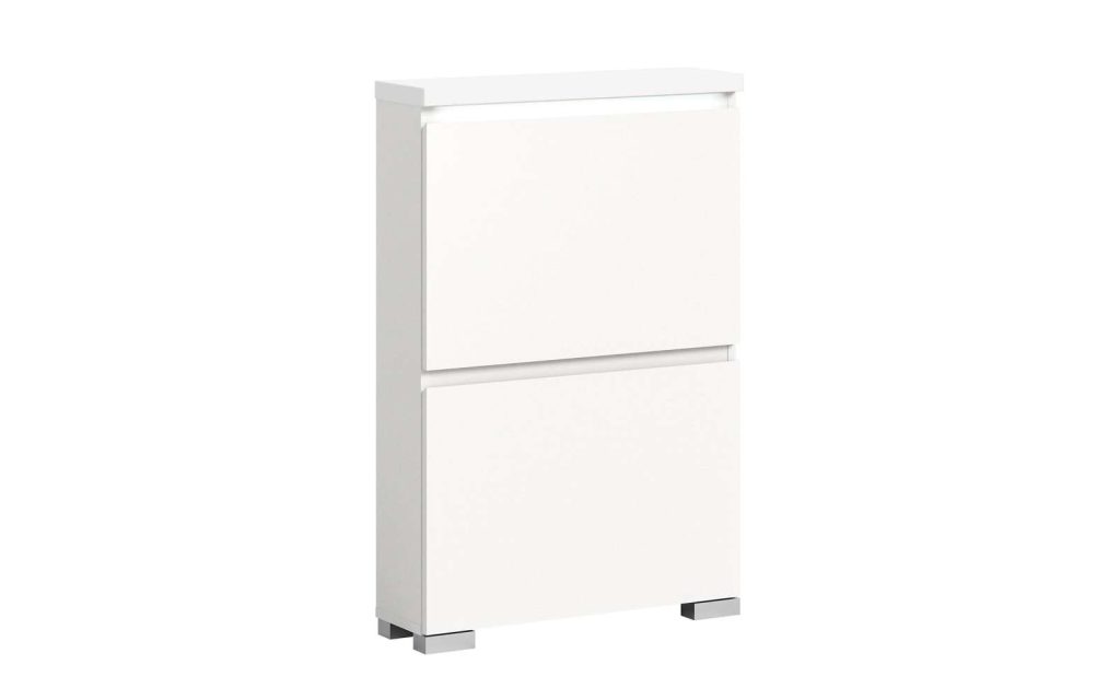 BemerkungSchuhschrank mit Korpus und Front aus FSC®-zertifiziertem Holzwerkstoff in weiß, Oberboden in weiß, Füße aus Kunststoff in silberfarbend, 2 Klappfächer, griffloses Design, ohne Beleuchtung, B/H/T ca. 60 x 109 x 40 cm.