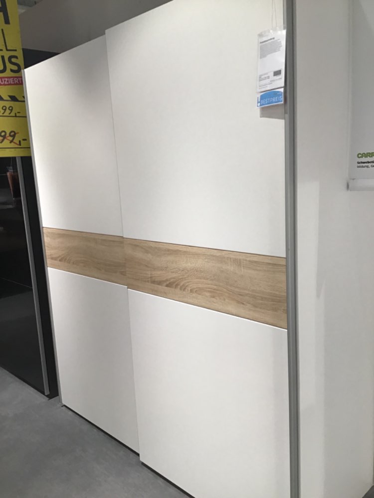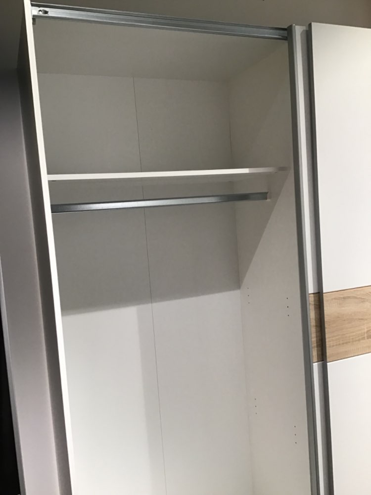 Mit zwei Einlegeböden und zwei Kleiderstangen ausgestattet, bietet der Austellungsware-Schrank eine flexible Inneneinteilung. Die Einlegeböden können nach Bedarf angepasst werden, um Kleidungsstücke oder Accessoires optimal zu verstauen, während die Kleiderstangen genügend Platz für Ihre Hemden, Kleider und Mäntel bieten. So lässt sich Ihre Kleidung organisiert und knitterfrei aufbewahren.
