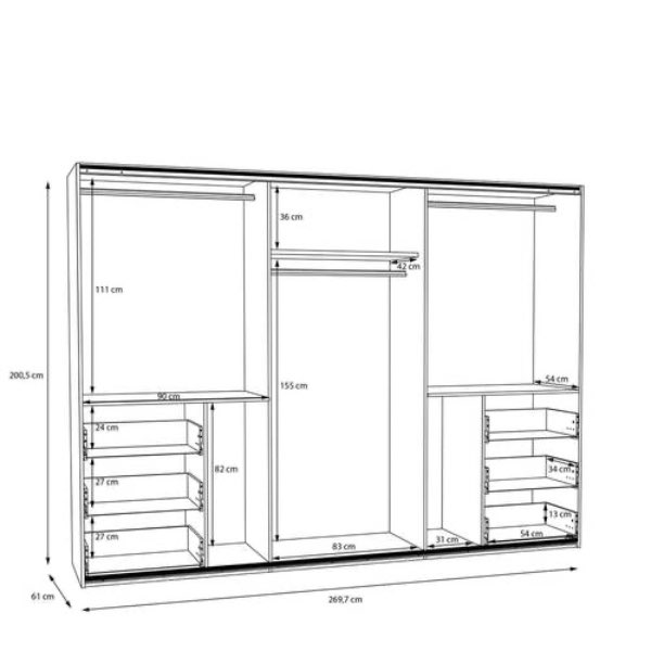 BemerkungDer Schwebetürenschrank Winn 2 bietet mit seinen großzügigen Maßen von 270x200x61 cm reichlich Stauraum und modernen Stil für Ihr Zuhause. Als Ausstellungsware präsentiert er sich in einem einwandfreien Zustand und ist bereit, Ihrem Schlafzimmer Eleganz und Funktionalität zu verleihen. Die sanft gleitenden Türen enthüllen im Inneren ein durchdachtes Design, das Platz für all Ihre Kleidungsstücke und Accessoires schafft. Mit drei Einlegeböden können Sie Ihre Lieblingsstücke sorgfältig organisieren, während drei Kleiderstangen ausreichend Platz für Ihre Garderobe bieten. Der Winn 2 vereint moderne Ästhetik mit durchdachter Funktionalität und ist die ideale Lösung für eine platzsparende und dennoch stilvolle Aufbewahrung. Dieser Schwebetürenschrank ergänzt jede Inneneinrichtung und trägt dazu bei, Ihr Schlafzimmer ordentlich und stilvoll zu gestalten.
