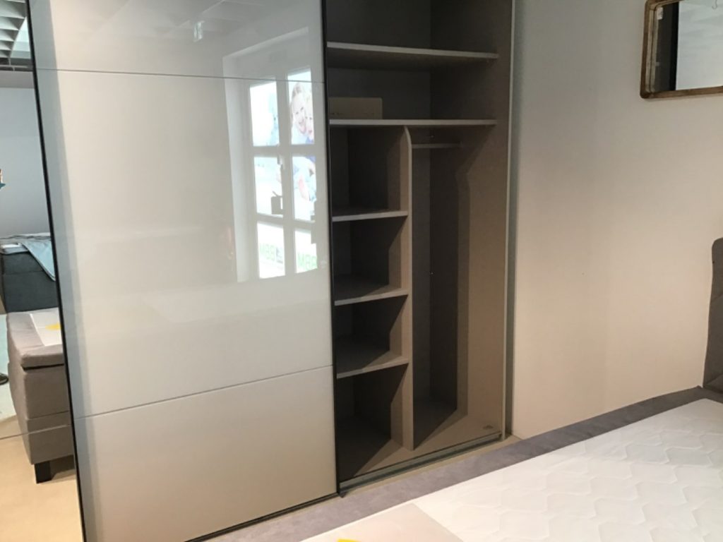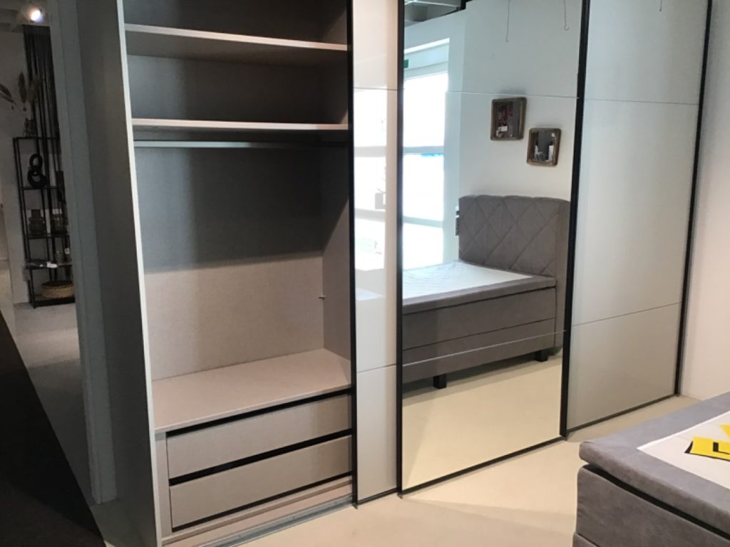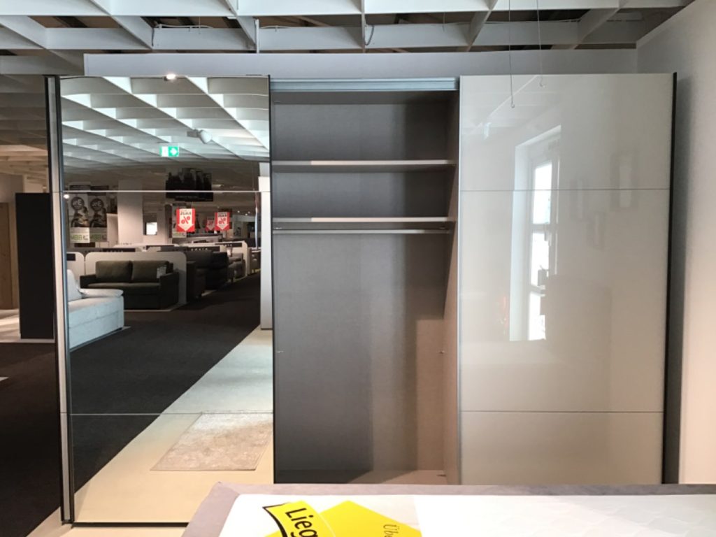 Moderner Schwebetürenschrank mit Glasauflage an den Türen. Gute Innenausstattung.