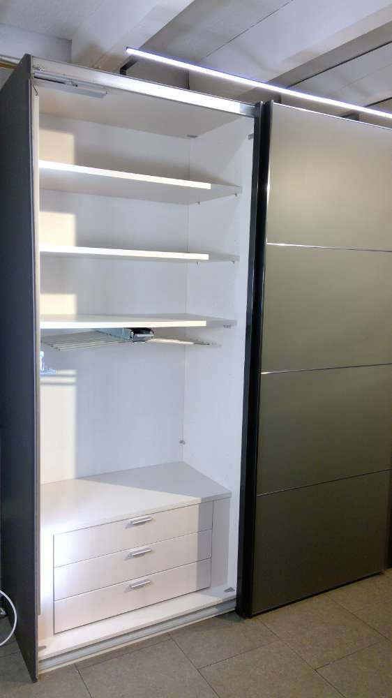 Bemerkung Der Schwebetürenschrank SinfoniePlus von STAUD präsentiert sich in einem edlen Dekor Anthrazit, das jedem Raum eine moderne und stilvolle Atmosphäre verleiht. Mit beeindruckenden Maßen von ca. 280x222x68 cm bietet dieser Schrank großzügigen Stauraum und fügt sich gleichzeitig harmonisch in Ihre Wohnlandschaft ein. Die schlanken Griffe und Zierleisten in Graphit verleihen dem Schrank ein elegantes und zeitgemäßes Erscheinungsbild. Als Austellungsware konzipiert, beinhaltet der SinfoniePlus nicht nur eine durchdachte Innenausstattung, sondern auch eine stimmungsvolle Beleuchtung, die die Struktur und Ästhetik des Schranks hervorragend zur Geltung bringt. Dieses Modell überzeugt durch seine hochwertige Verarbeitung und das vielfältige Design, das sowohl funktionale als auch visuelle Ansprüche erfüllt. Der Schrank eignet sich ausgezeichnet für all jene, die Wert auf eine Kombination aus Funktionalität und modernem Design legen. Artikelstandort: Möbel May Ulmen, Mayen und Neuwied Ihr Ansprechpartner: Hannah Breuer Art. 32594/78 Wir sind für Anfragen Dienstags-Freitags von 9:30-18:30, Samstags bis 16 Uhr erreichbar! Um nachhaltig Energie einzusparen, verzichten wir seit dem vergangenen Jahr auf die Ladenöffnung am Green Monday und werden somit mit einer Vielzahl an weiteren Maßnahmen unserer ökologischen Verantwortung gerecht. Bitte berücksichtigen Sie dies bei Ihren Anfragen um lange Antwortzeiten zu vermeiden. Besten Dank für Ihr Verständnis!