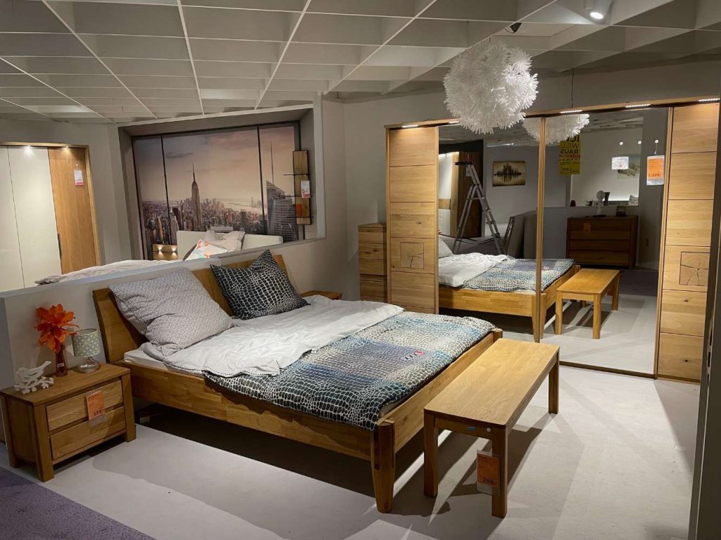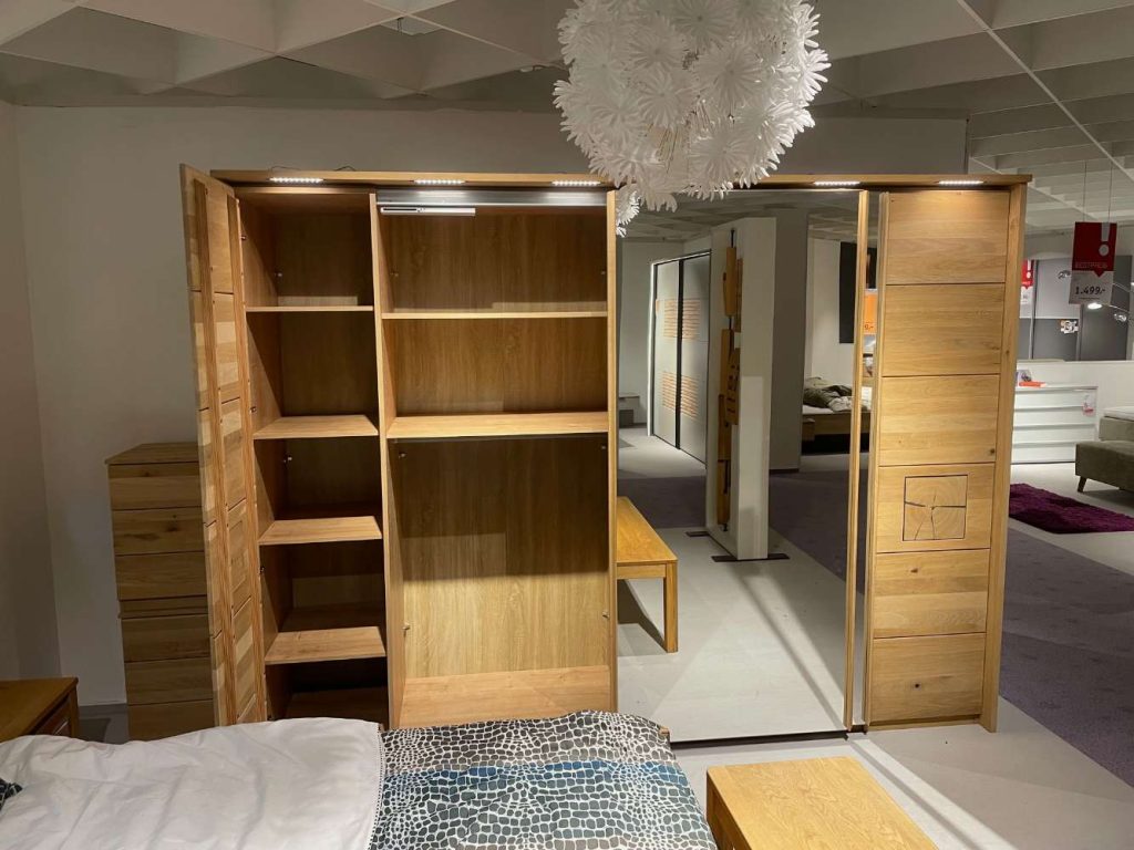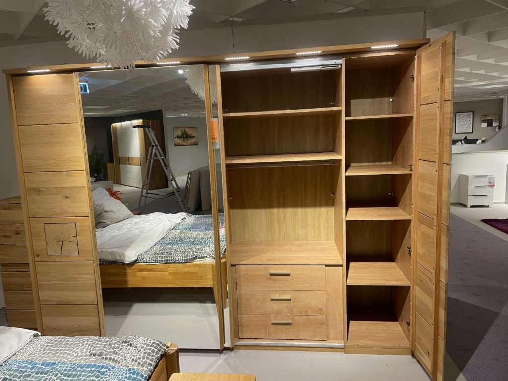 Schwebetürenschrank in Eiche Teilmassiv (B/H/T) 286x215x74cm Inkl 12x Einlegeboden 2x Kleiderstange 1x Schubkasteneinsatz Inkl. Pasepartoutrahmen mit Beleuchtung Wie ausgestellt, Abholung jederzeit möglich :)
