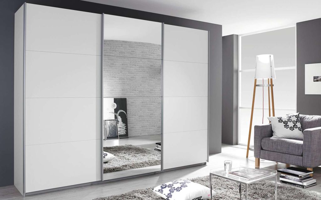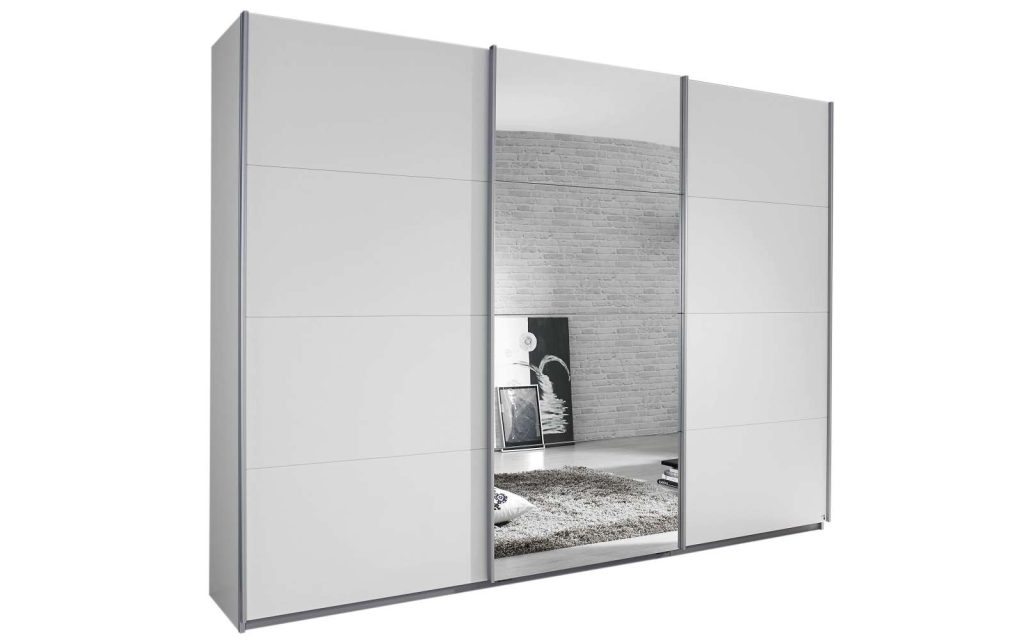 Farb-BeschreibungAusführung Korpus in alpinweiß und Front in seidengrau, 3-türig mit 1 Spiegeltür