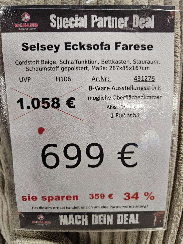 Selsey Couch Ecksofa Farese Cordstoff Beige statt 1058€