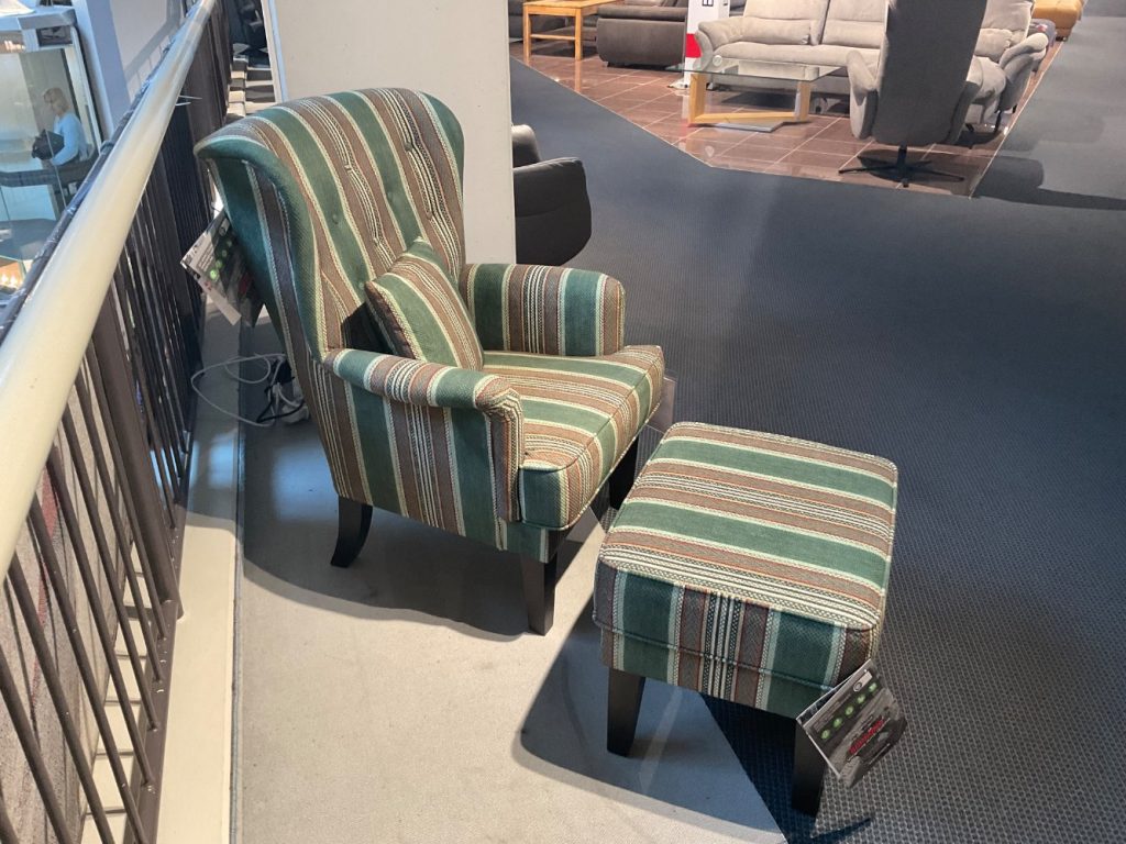 BemerkungErleben Sie ultimativen Komfort mit diesem exquisiten Ohrensessel von SCHRÖNO, der in einem ansprechenden Stoff mit grünem Streifenmuster gestaltet ist. Dieser Sessel ist nicht nur ein Blickfang, sondern bietet auch höchsten Sitzkomfort dank des festen Sitzes auf Nosag Wellenfedern. Die exquisit gearbeiteten Füße aus massiver Buche in einem eleganten maronfarbigen Finish verleihen dem Sessel seine robuste Stabilität und zeitlose Eleganz. Die großzügigen Maße von 75 cm Breite, 103 cm Höhe und 80 cm Tiefe laden zu entspannten Stunden ein. Die Ausstellungskollektion wird durch den passenden Hocker und ein gemütliches Kissen abgerundet, sodass Sie Ihren Lieblingsplatz individuell gestalten können. Dieser Ohrensessel verbindet stilvolles Design mit praktischen Extras und schafft so ein harmonisches Ambiente in jedem Wohnraum.