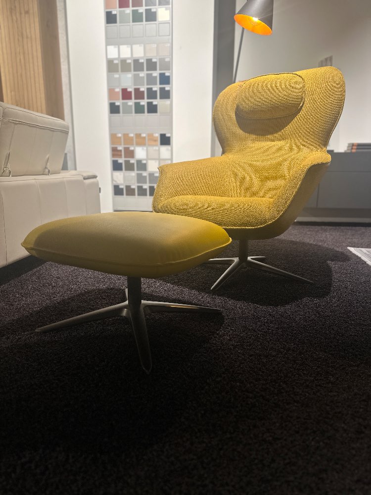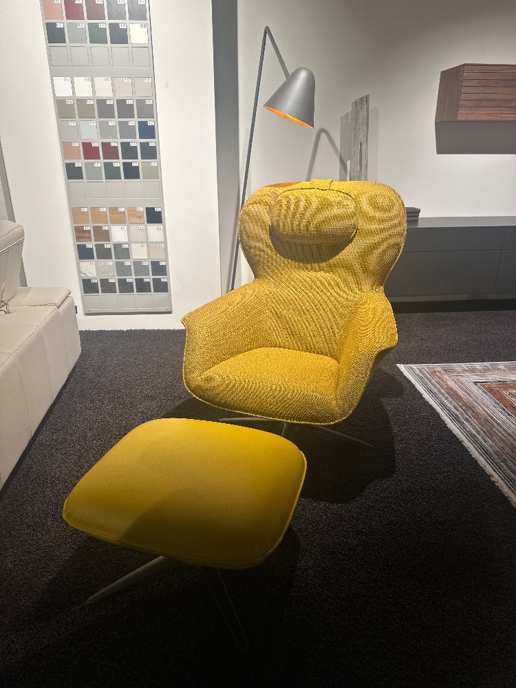 Sessel: B/H/T ca. 88x106x90 cm; Hocker: B/H/T ca. 60x40x55 cm; Kissen: ca. 25x40 cm