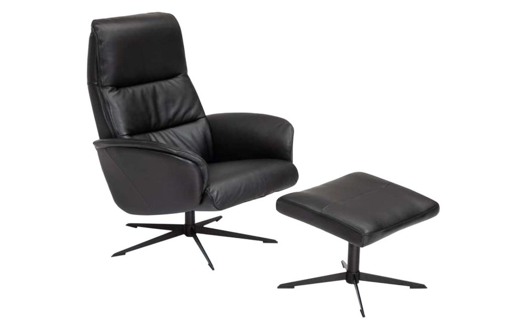 Bemerkung Sessel mit Hocker aus Stoff Python in anthrazit, formschöner Sternfuß in schwarz, Rücken echt bezogen, inklusive manuelle Relax-Funktion, Hocker, B/H/T ca. 74 x 106 x 74 cm.