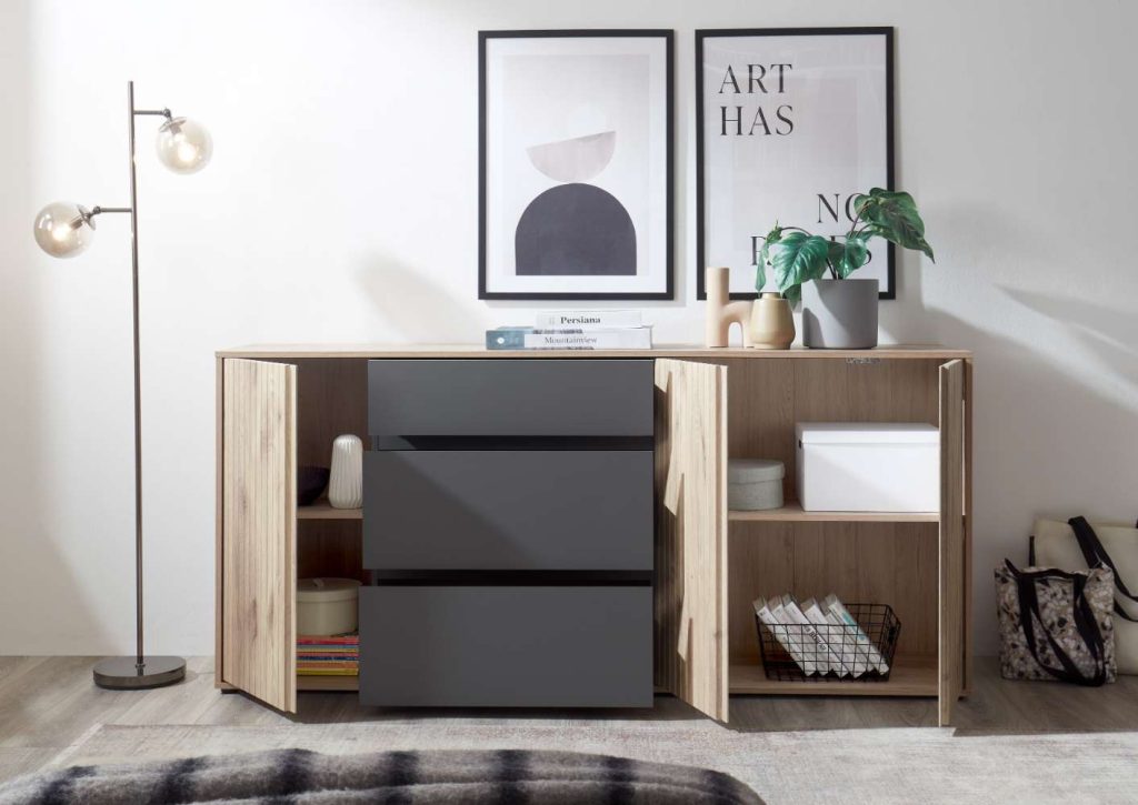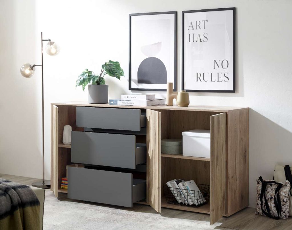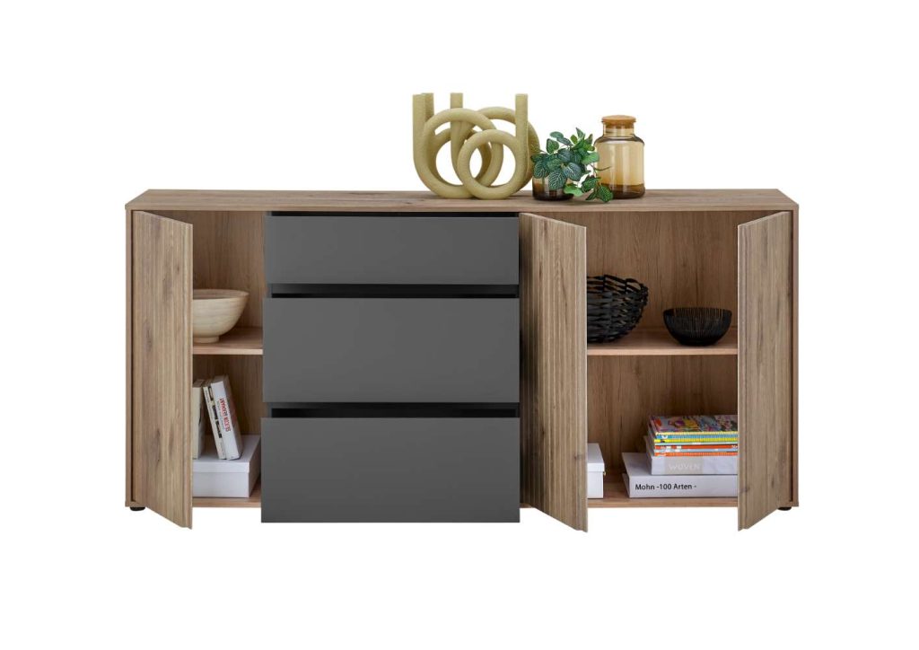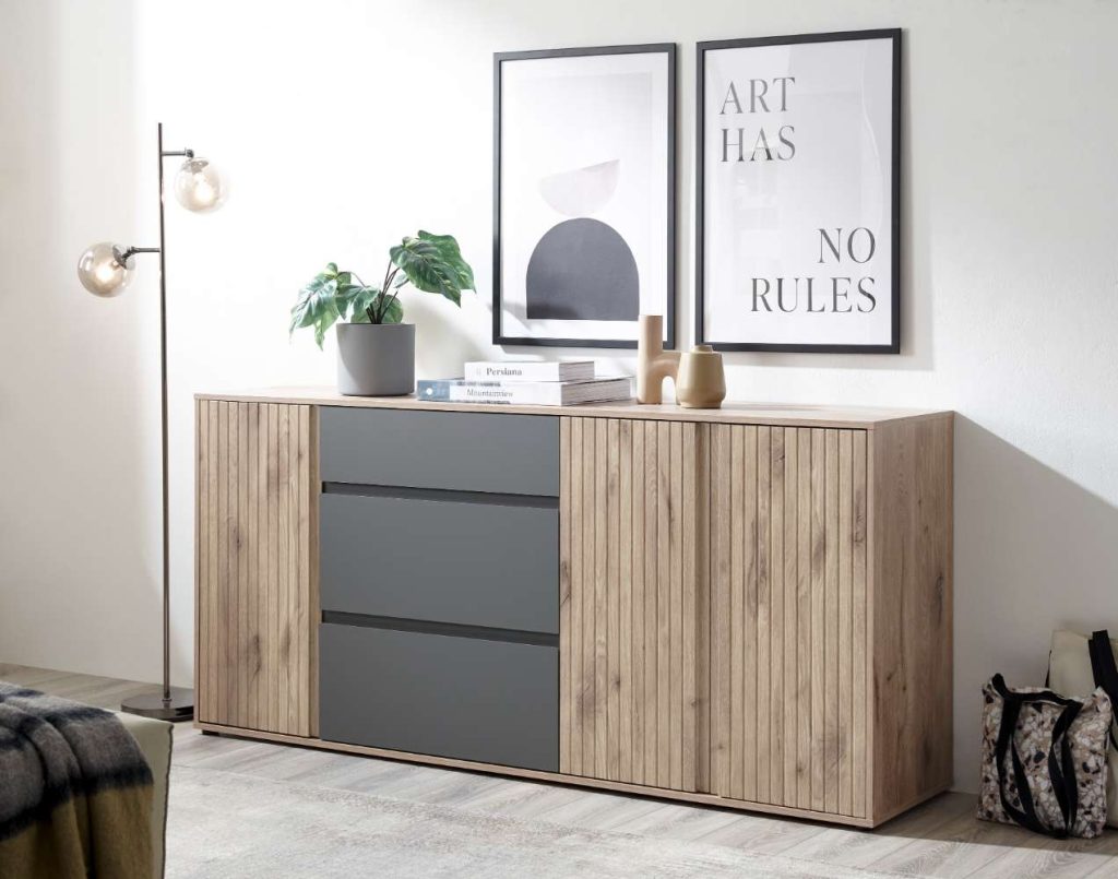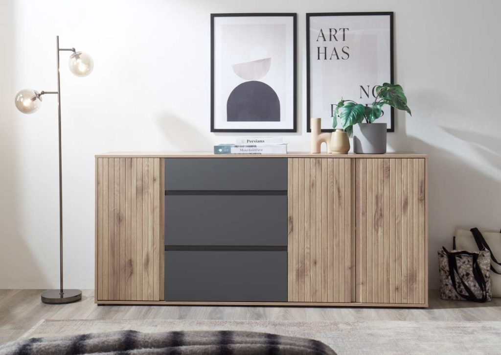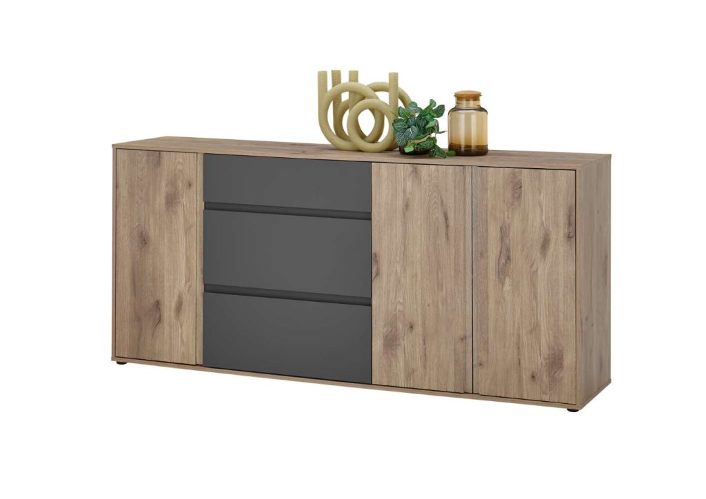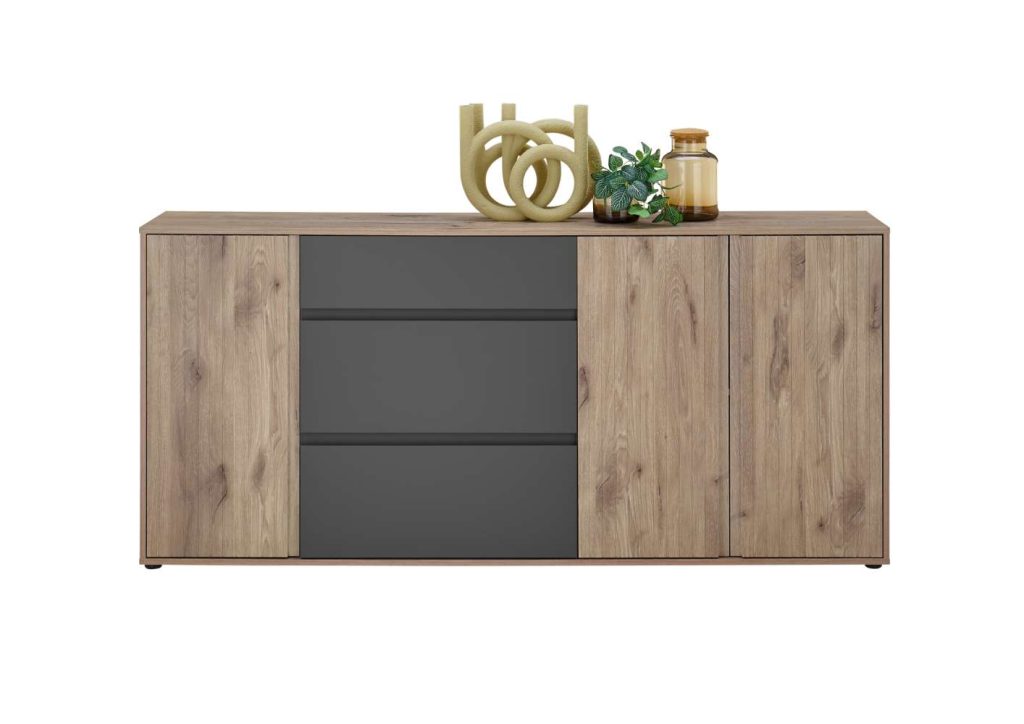 Sideboard Korpus und Front in Viking Oak, Absetzung in Grau, mit Griffmulden, 3-türig, 3 Schubkästen, B/H/T ca. 186x85x42 cm.