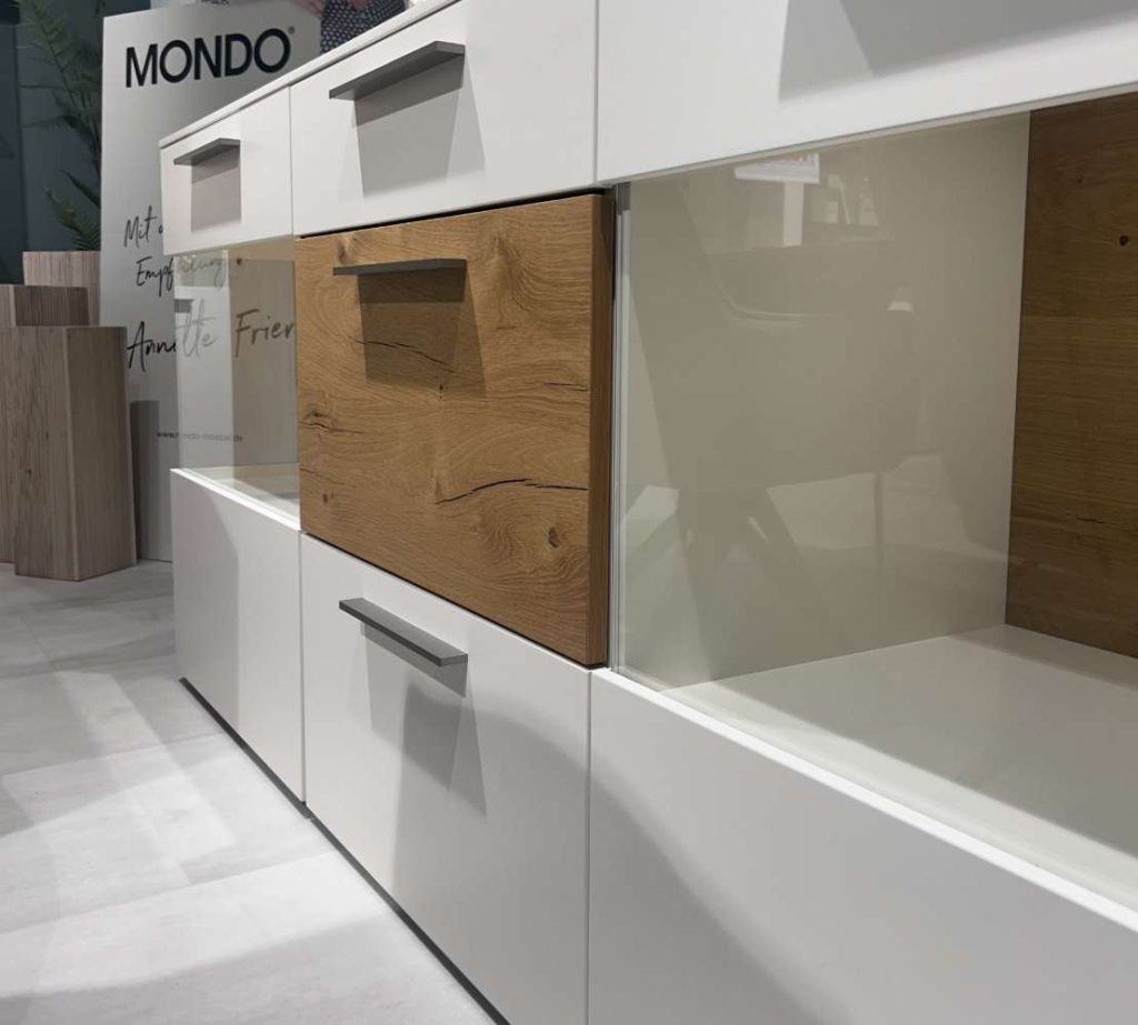 Lack weiß seidenmatt/Akzent Balkeneiche honig furniert/GriffEdelstahloptik