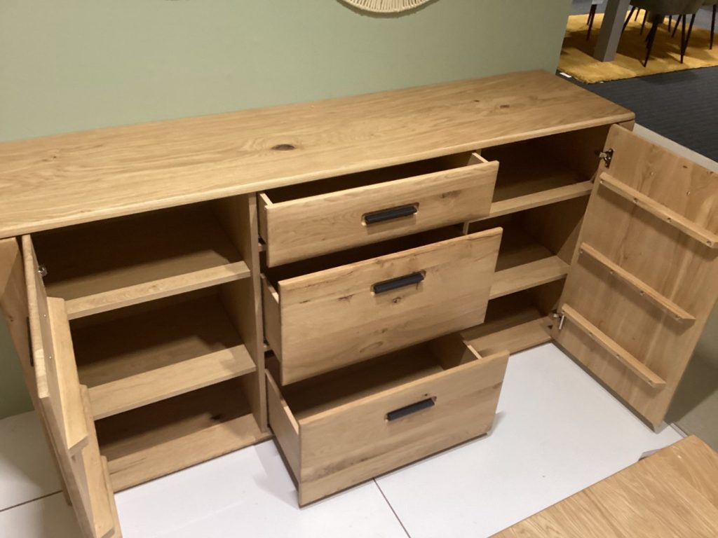 Das Sideboard verfügt über 2 Türen und 3 Schubkästen. Die Türen und die Schubkästen sind gedämpft. Zudem besitzten die Schubkästenen eine Unterflurführung