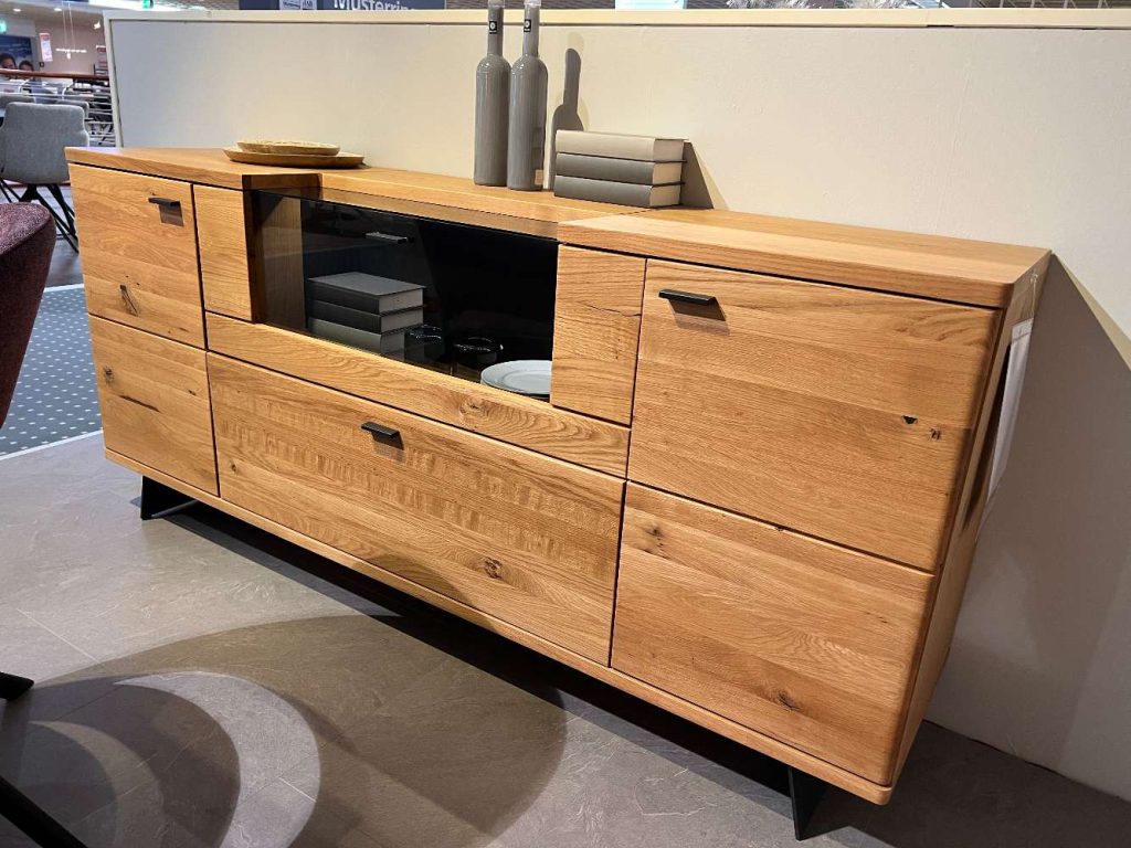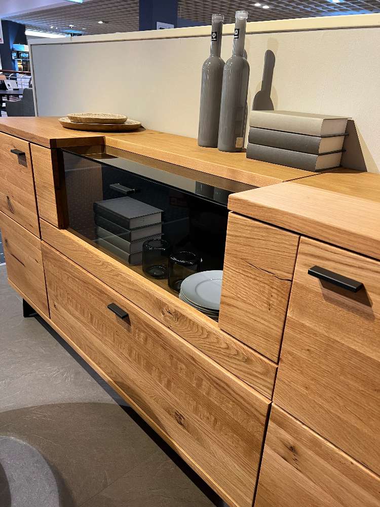 BemerkungEntdecken Sie die natürliche Schönheit und zeitlose Eleganz dieses Möbelstücks aus massiver Wildeiche, das geölt wurde, um die einzigartige Maserung und den warmen, goldenen Ton des Holzes hervorzuheben. Dieses Produkt vermittelt nicht nur ein Gefühl von Qualität und Beständigkeit, sondern besticht auch durch seine Vielseitigkeit und passt sich nahtlos in verschiedene Wohnstile ein. Als Ausstellungsware ist es bereits sorgfältig verarbeitet und präsentiert sich mit einem gewissen Charme, der es von neu produzierten Artikeln unterscheidet.