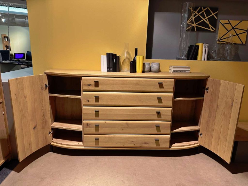Mit einer Breite von 195 cm, einer Höhe von 103,9 cm und einer Tiefe von 39,1 cm bietet Kiana nicht nur ausreichend Stauraum, sondern auch diverse Organisationsmöglichkeiten. Es verfügt über eine Tür und vier Einlegeböden, die individuell angepasst werden können, sowie fünf geräumige Schubkästen. Der Schubkasten mit Vollauszug und Antirutschmatte bietet einen besonderen Komfort, da er den Zugriff auf und die Ordnung im Inneren erleichtert.