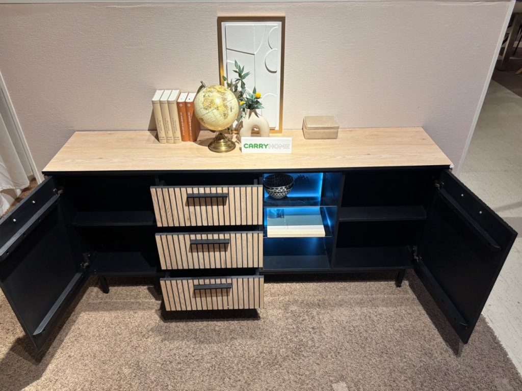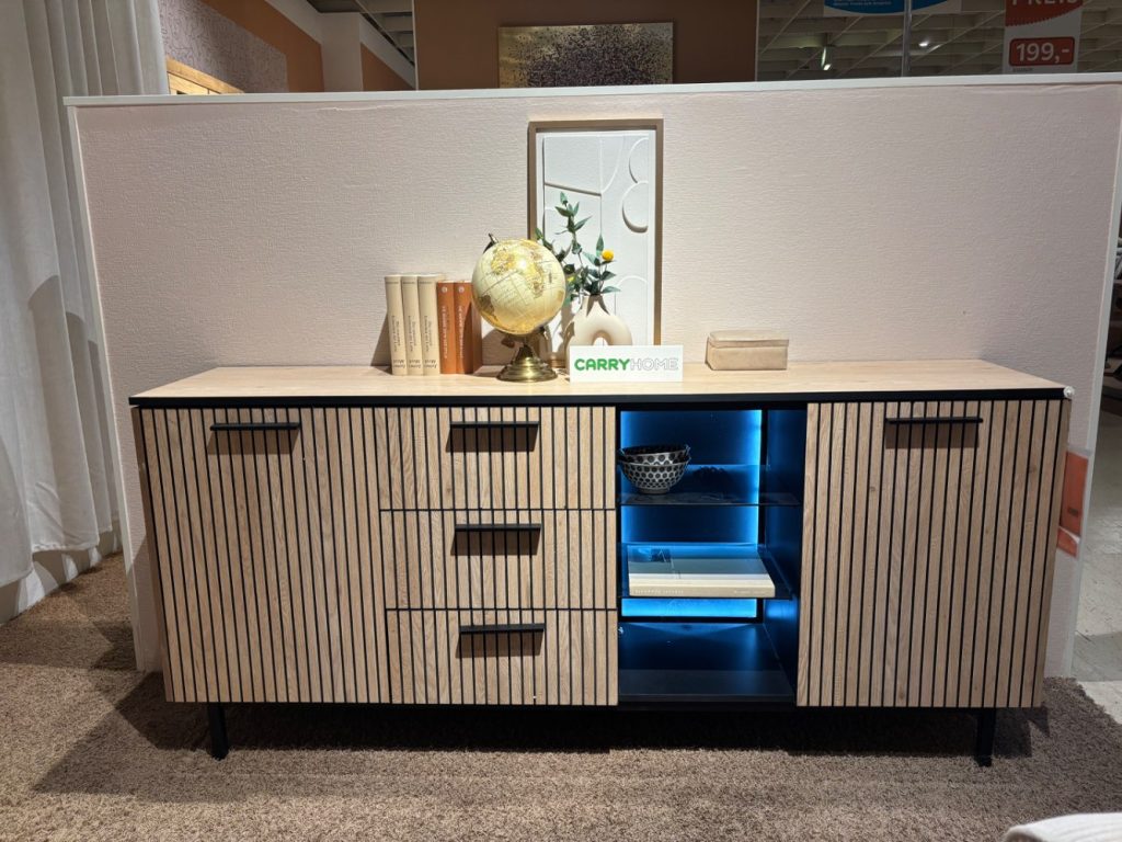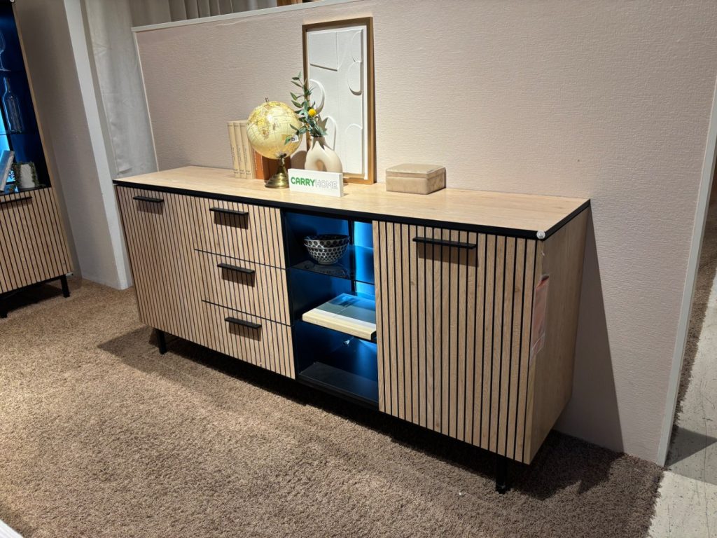 Sideboard: - B / H / T: 180 x 80 x 42 cm - Türen: 2 - Griffe: Griffleiste - Beleuchtung - Füße: Rund